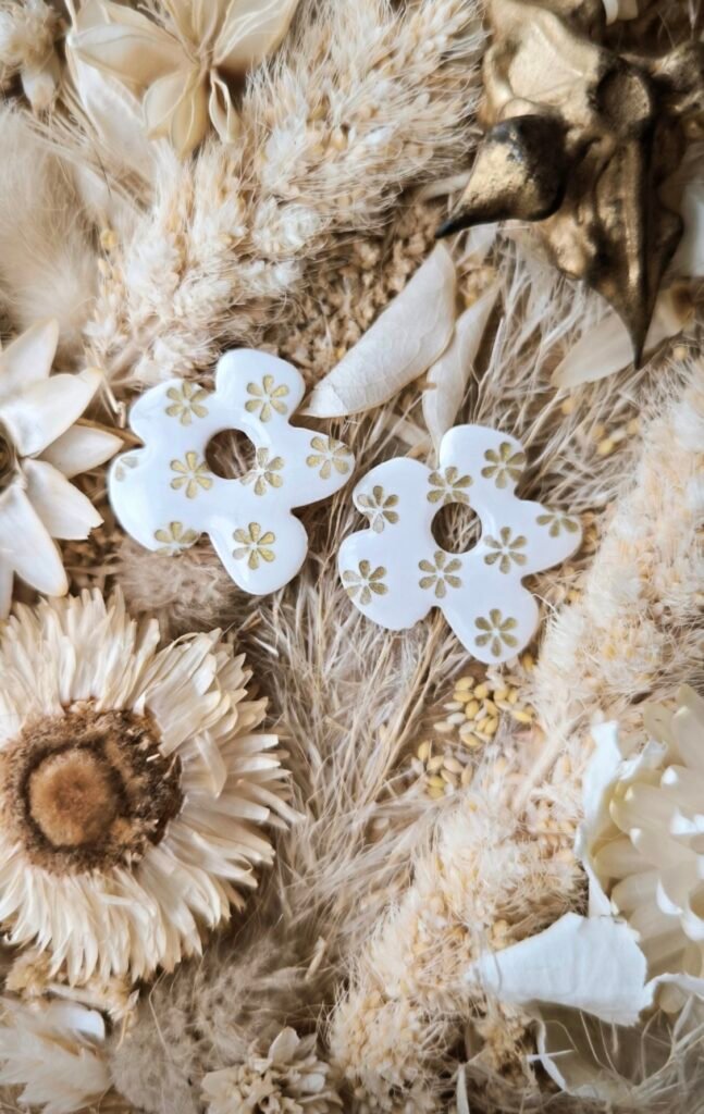 12,00 €Magnifiques pampilles Fait main, fleurs dorees poinçonnées une à une, en argile polymère pour boucles d’oreilles interchangeables