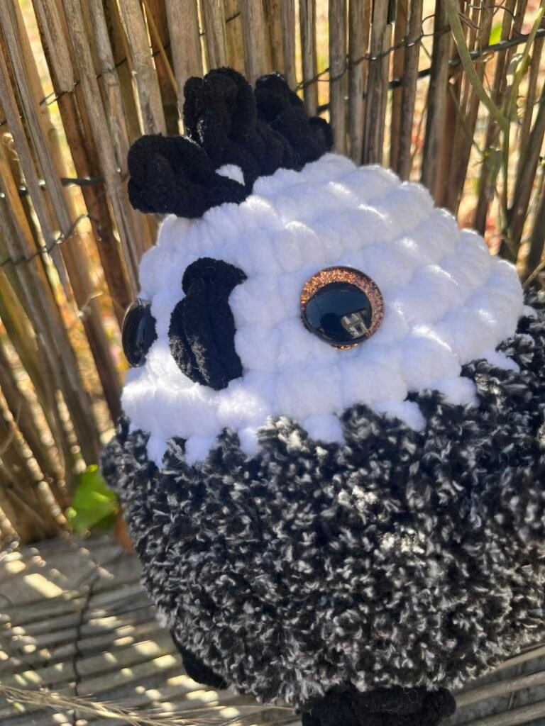 C’est une peluche d’assez grande taille, elle fait 30cm de hauteur. C’est une pièce unique réalisée en crochet avec du fil de coton.