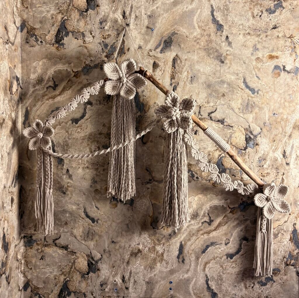 Composée de fleurs texturées, de détails noués et de longues franges, elle apporte douceur, poésie et naturel à un intérieur bohème.