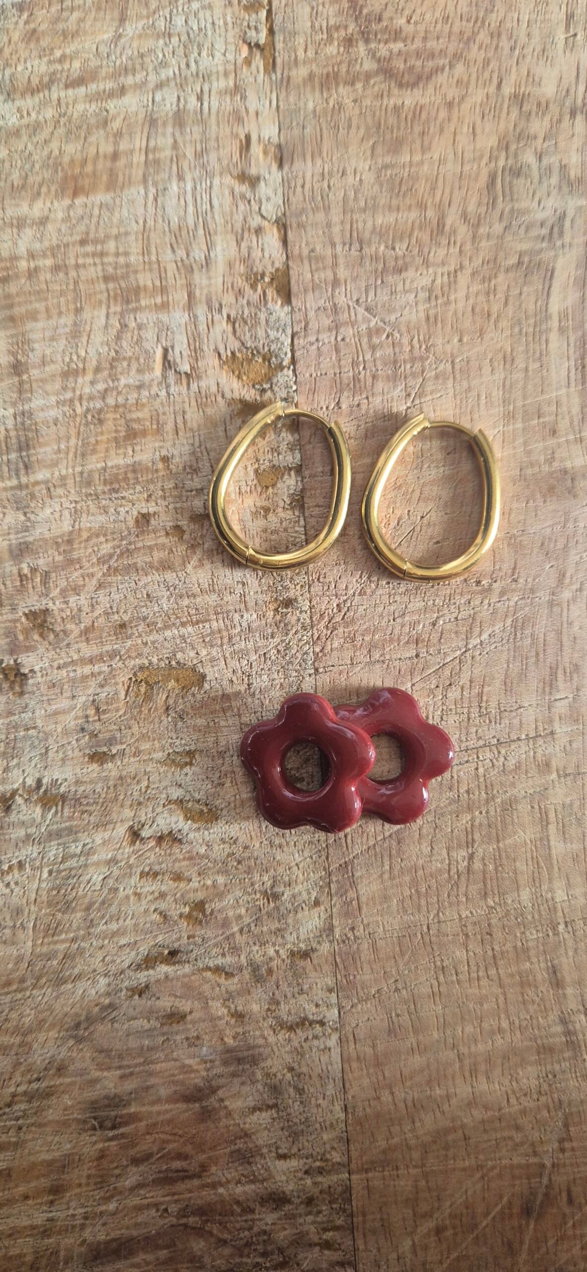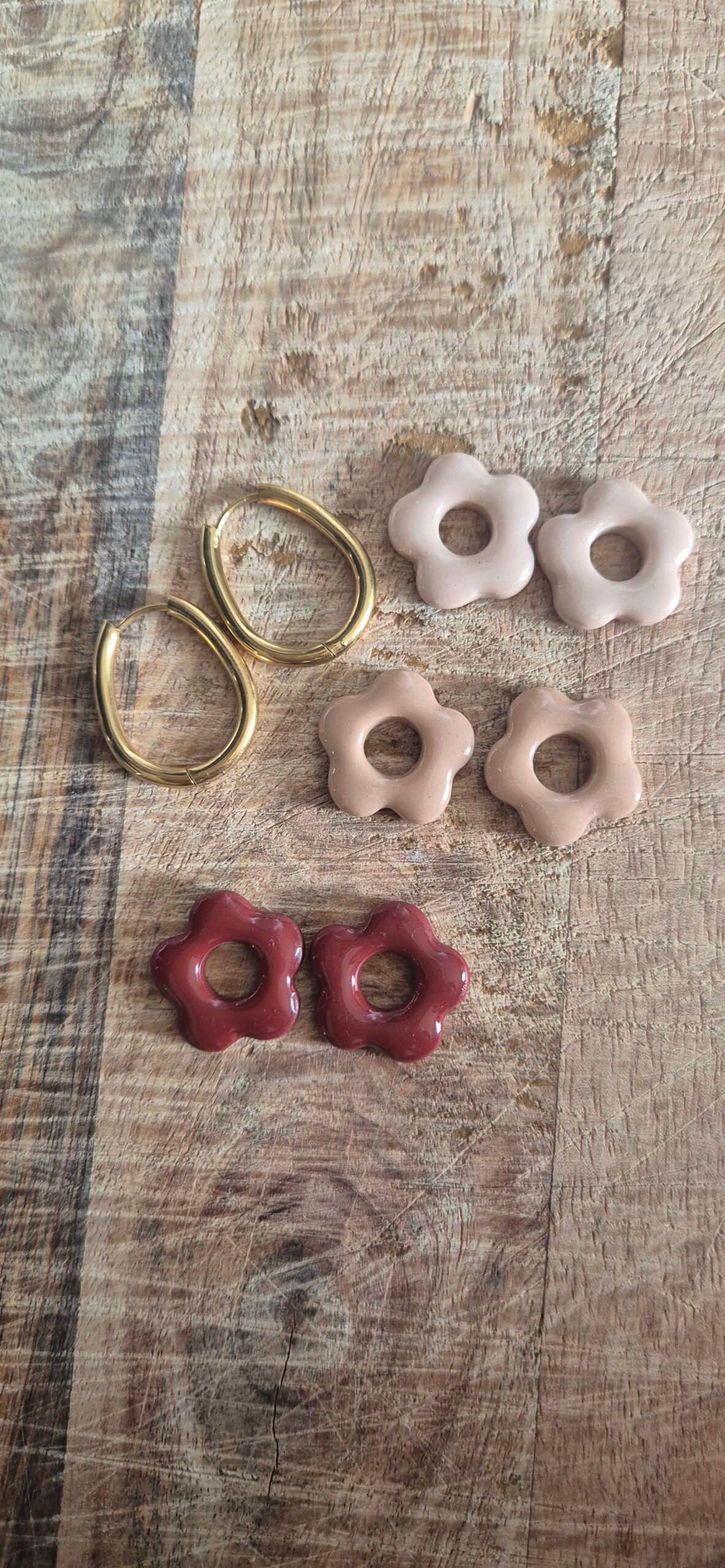 Alliez créoles dorées et 3 paires de pampilles interchangeables (rouge profond, nude et beige clair) pour un style unique à chaque jour 🌿