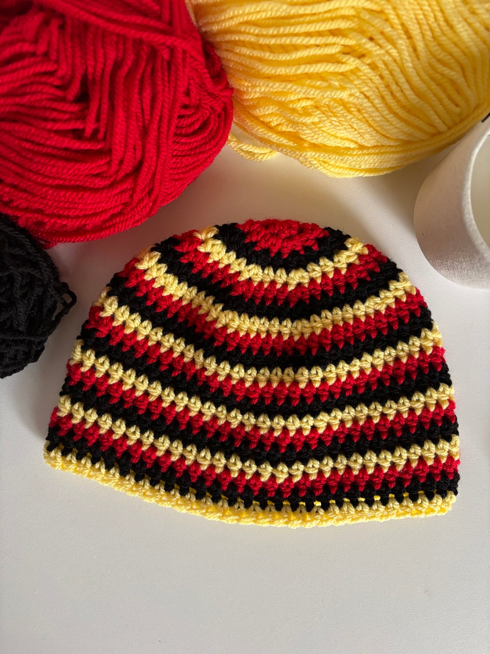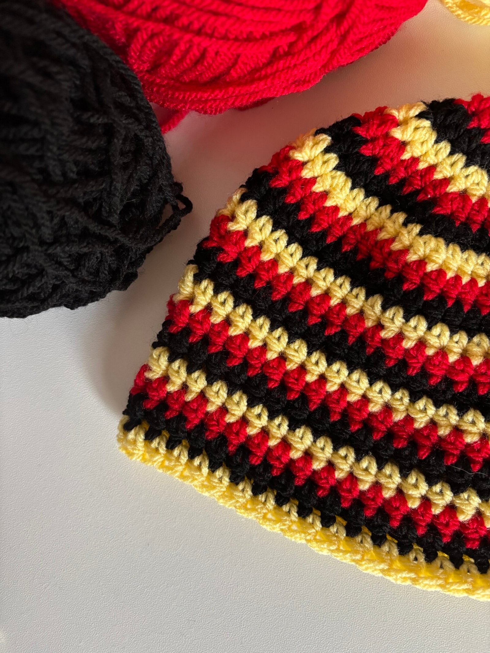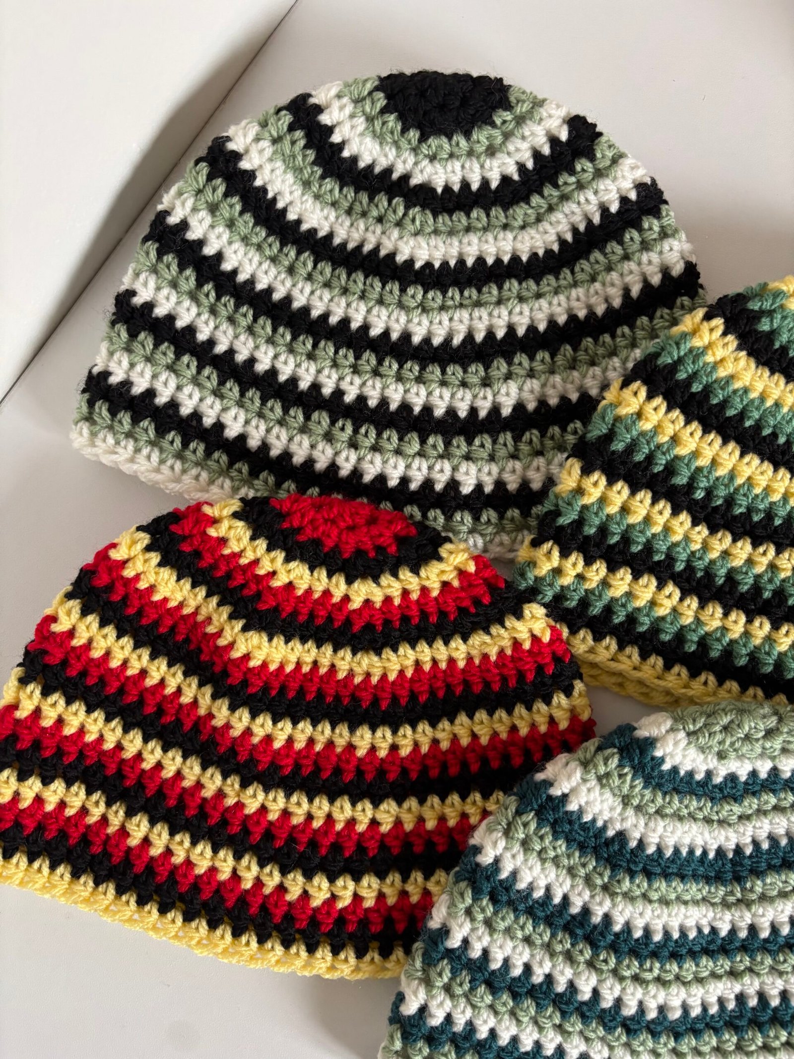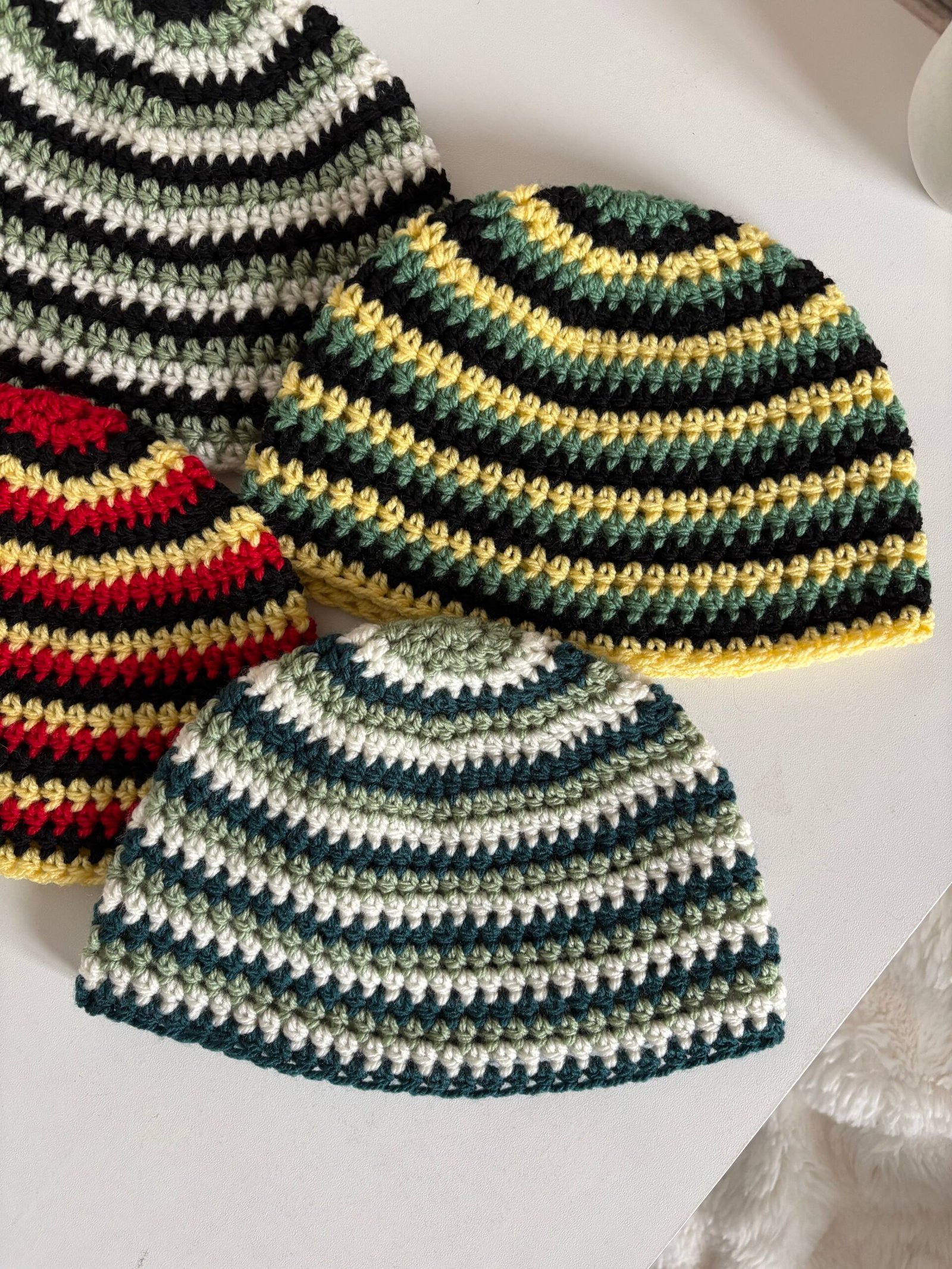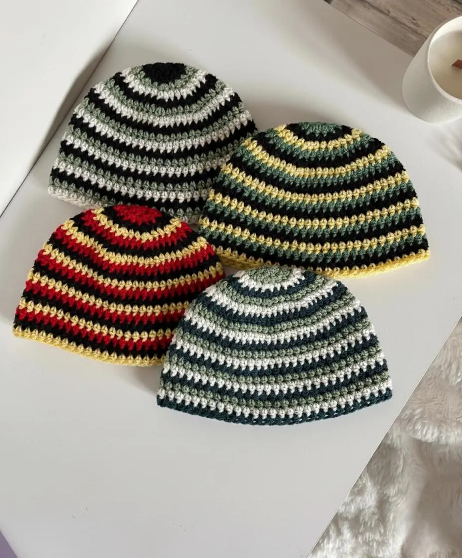 Bonnets rayés en crochet tricolore entièrement fait main avec soin.