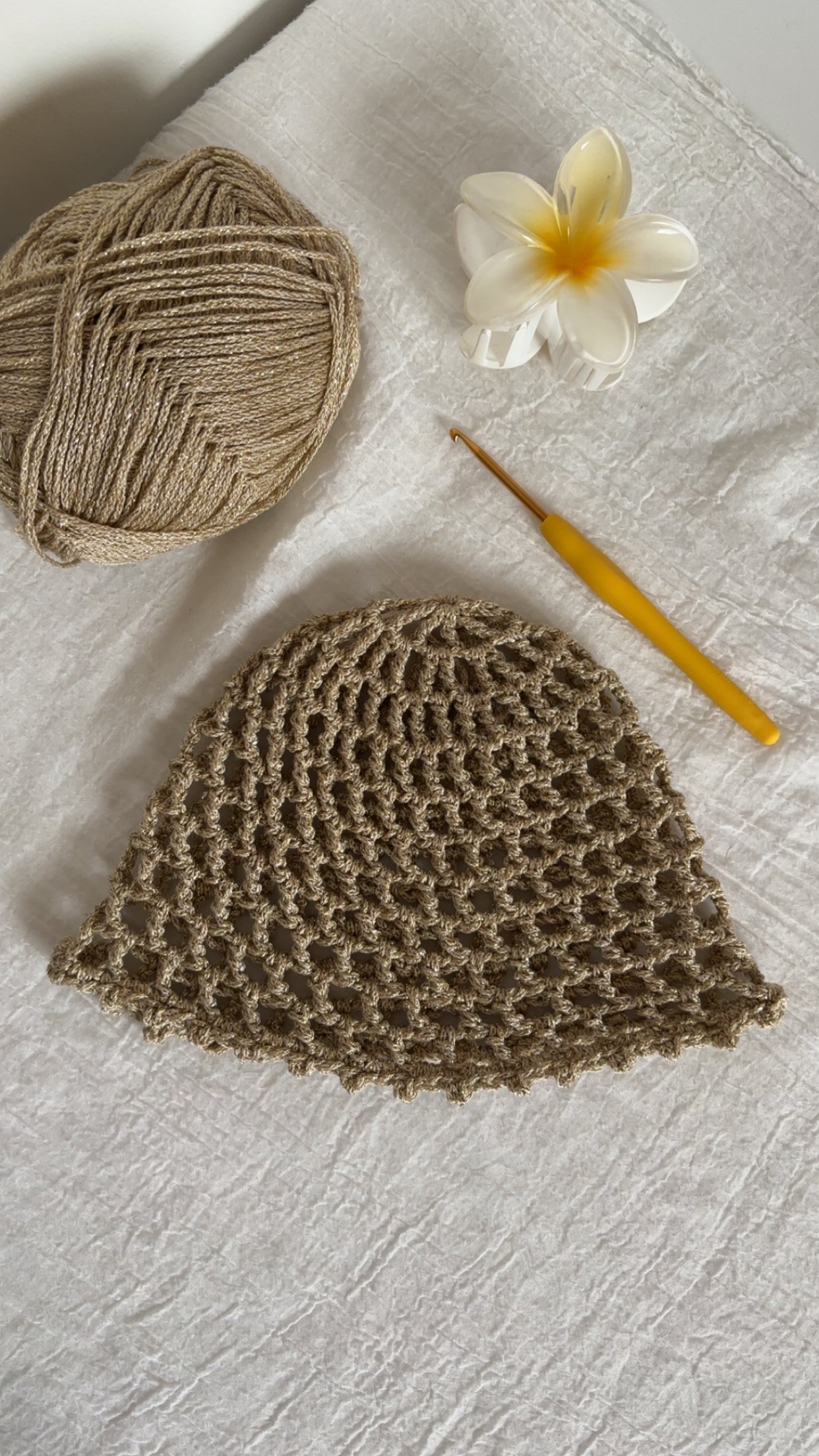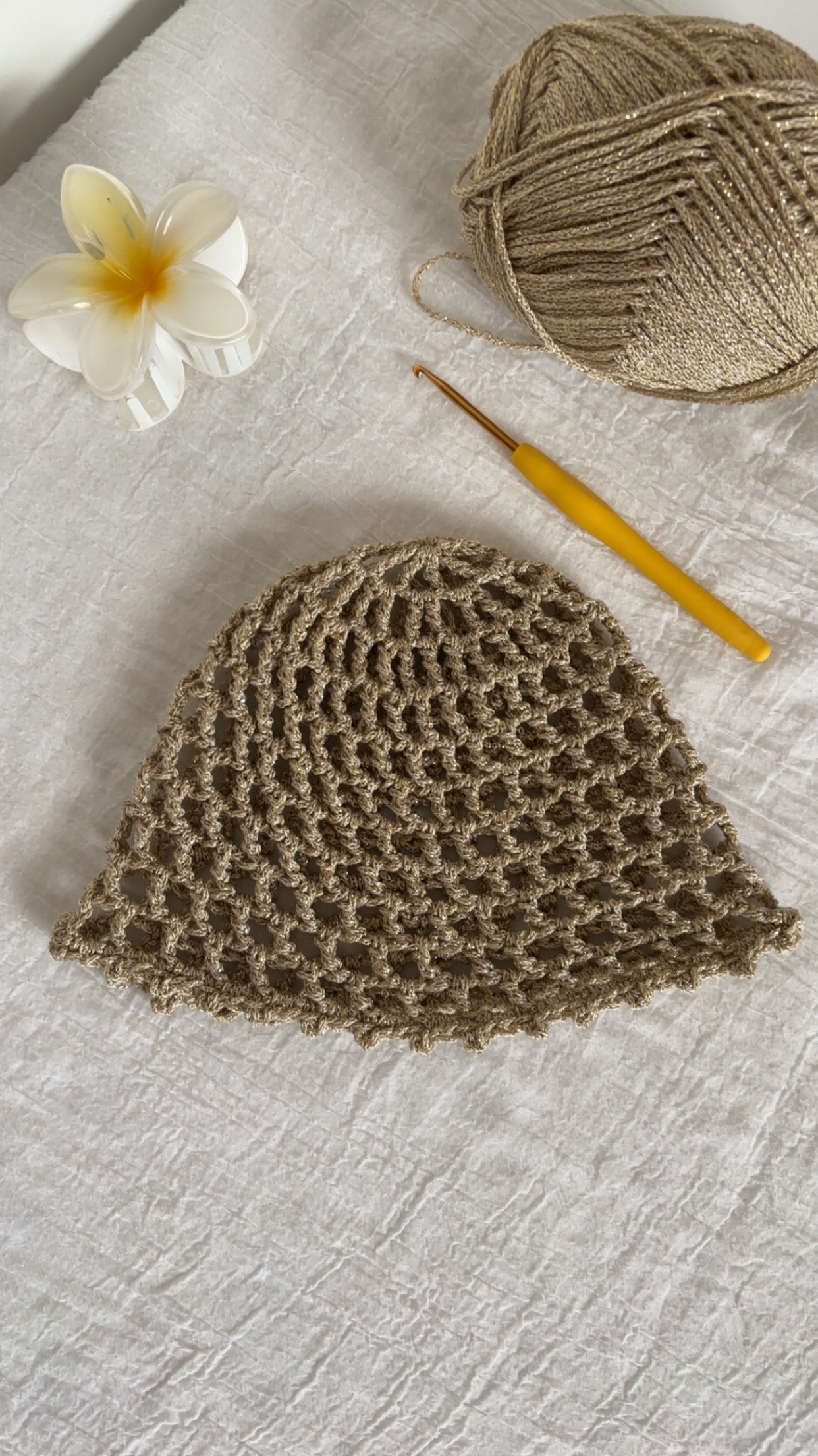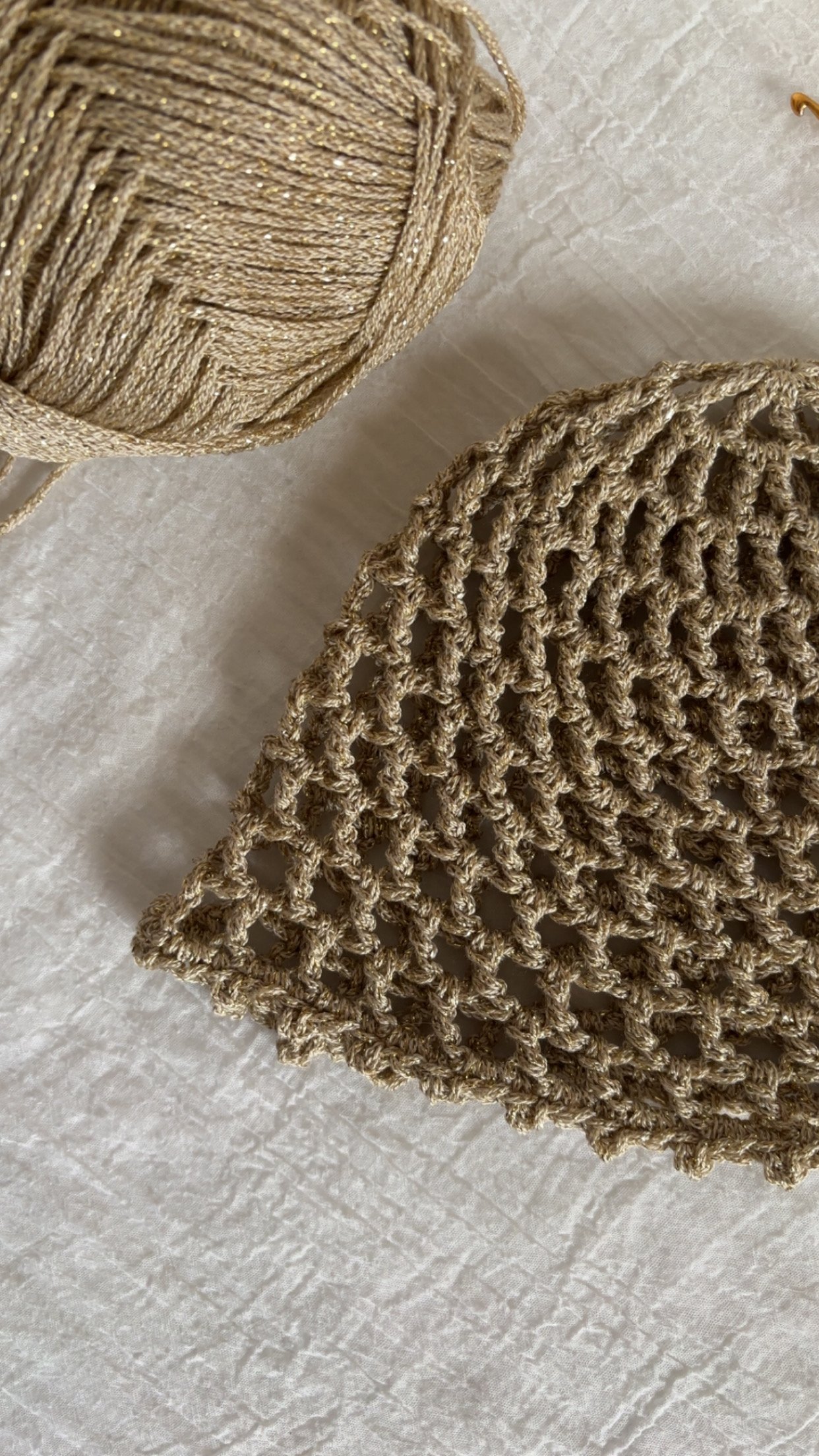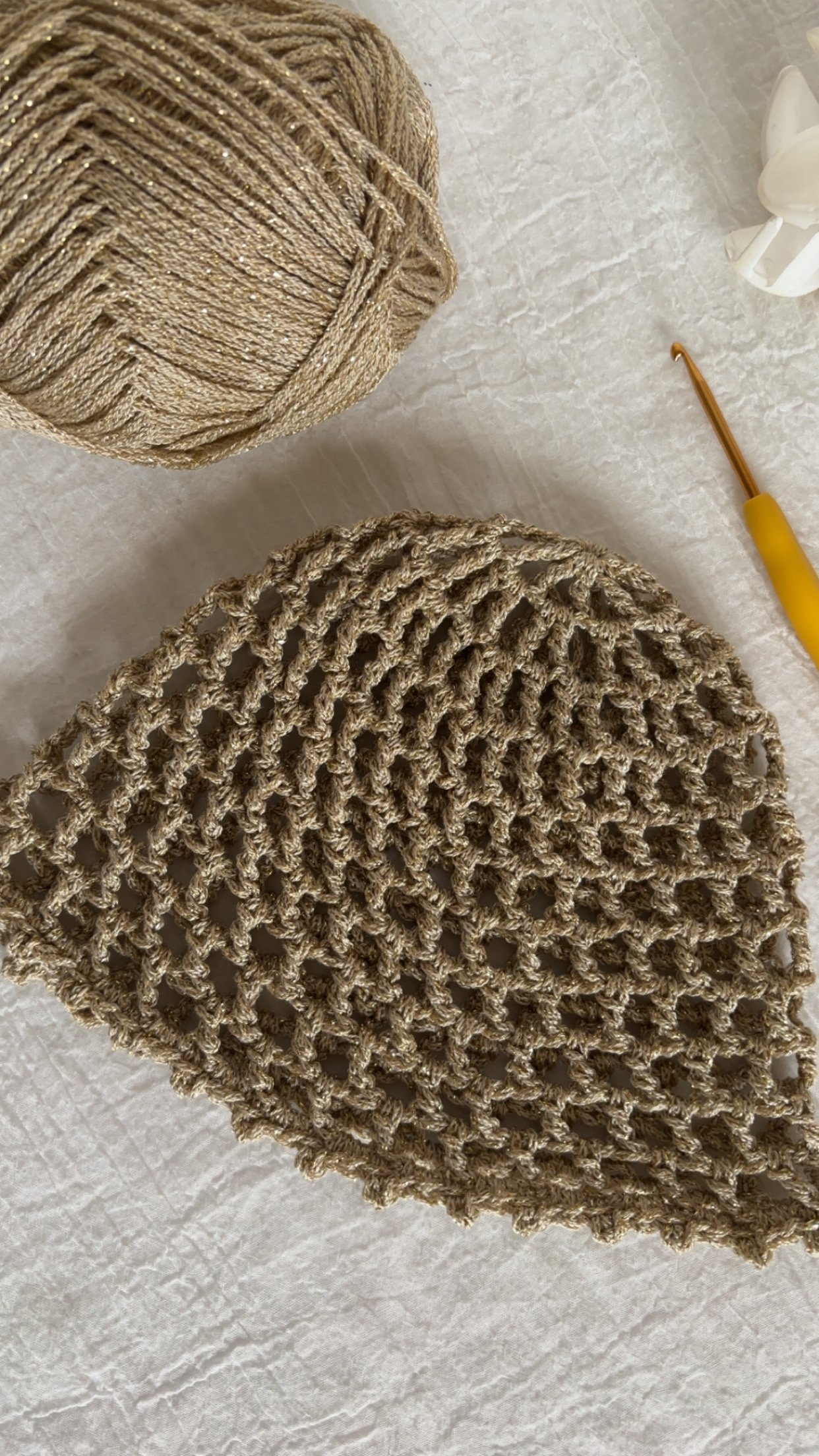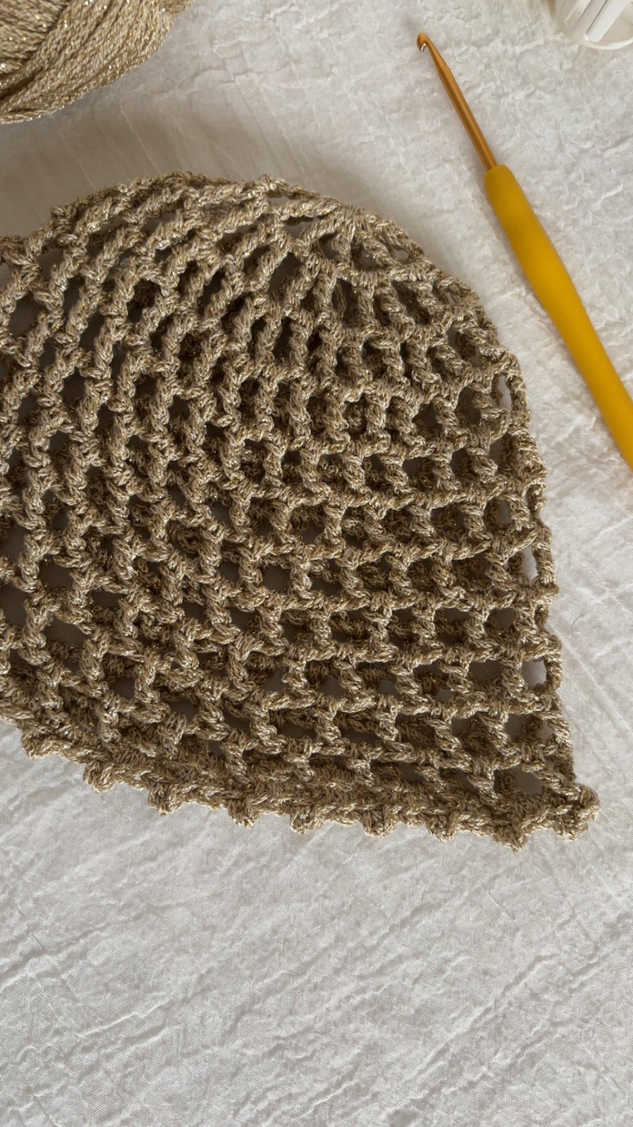 Ce bonnet en crochet confectionné à la main avec soin se distingue par son point ajouré (point mesh) et de son délicat fil doré qui captent la lumière ✨