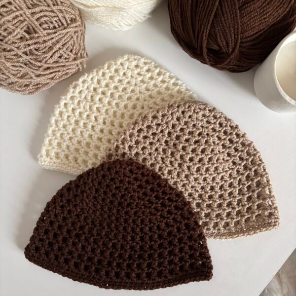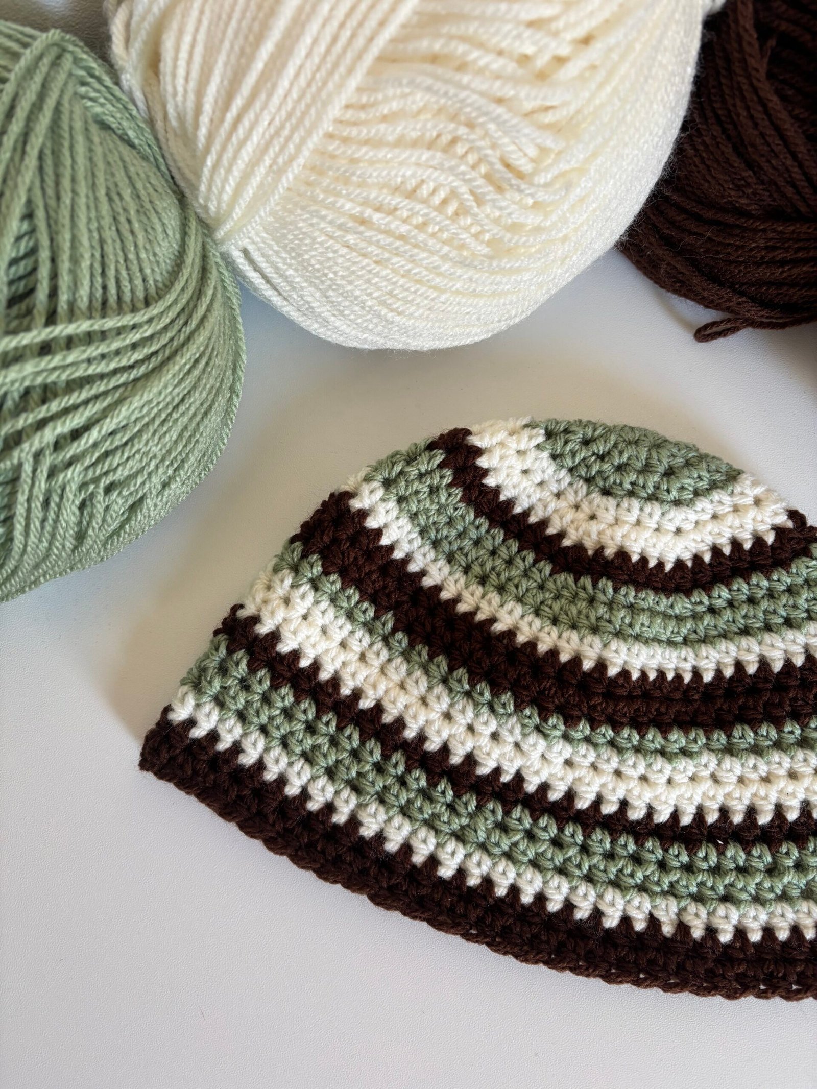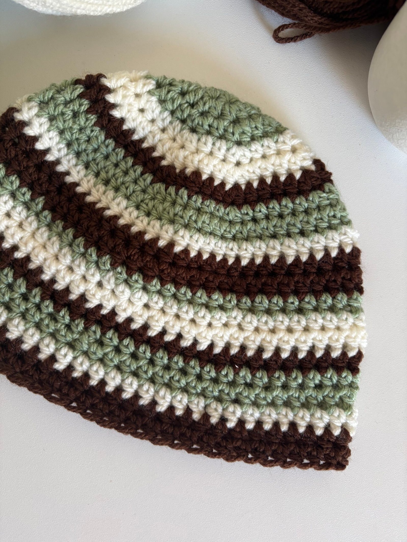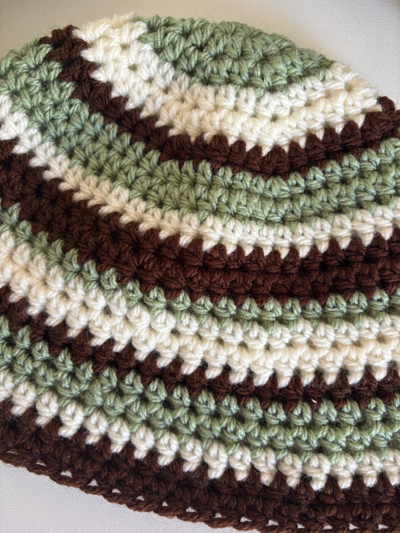 Soyez le premier à laisser votre avis sur “Bonnet en crochet tricolore marron vert et blanc crème”