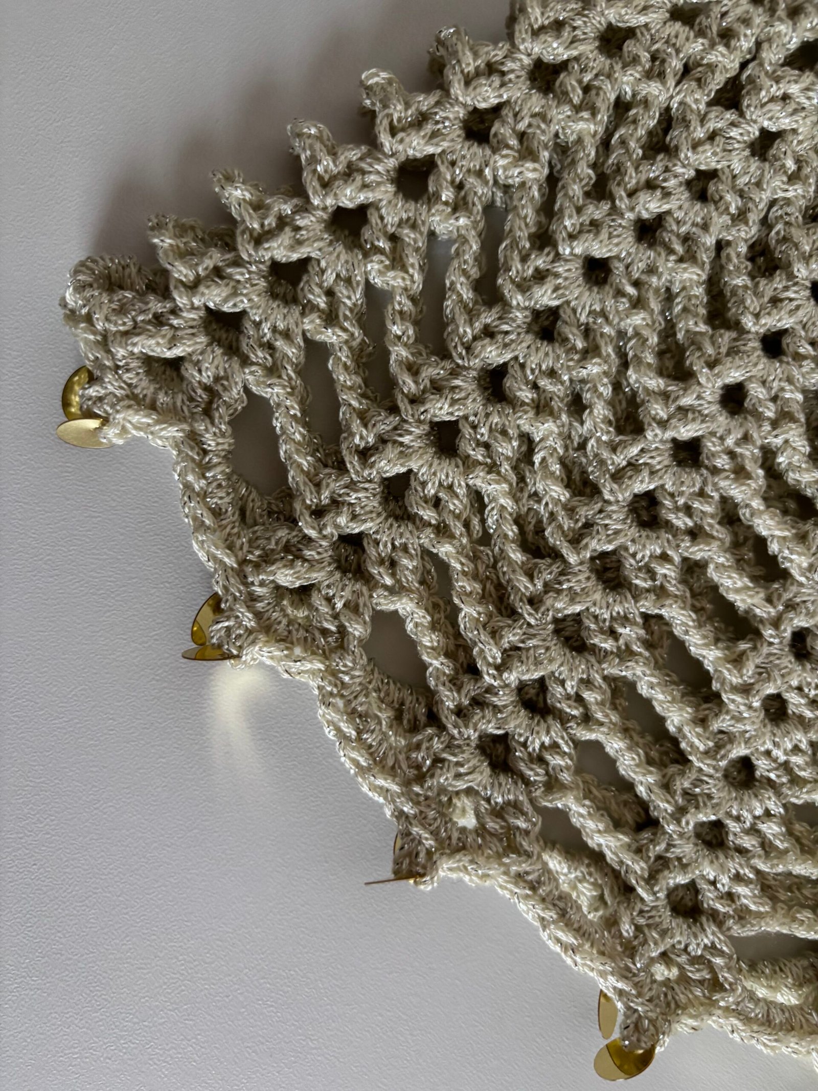 🧵 Matière : Fil acrylique/coton brillant de qualité, sequins dorés sur les bords