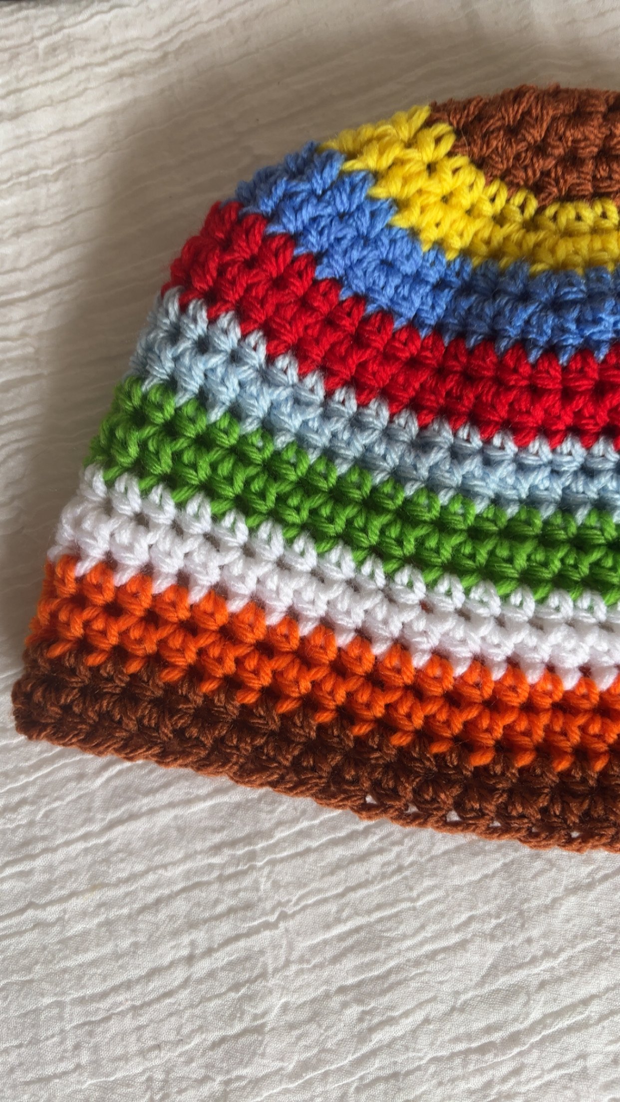 Un bonnet en crochet multicolore, réalisé avec des rayures horizontales aux couleurs vives (marron, jaune, bleu, rouge, gris, vert, blanc et orange). Il est confectionné en mailles serrées, avec une bordure marron plus foncée en bas et un sommet arrondi. Le bonnet est posé sur un tissu blanc texturé, ce qui met bien en valeur ses couleurs.