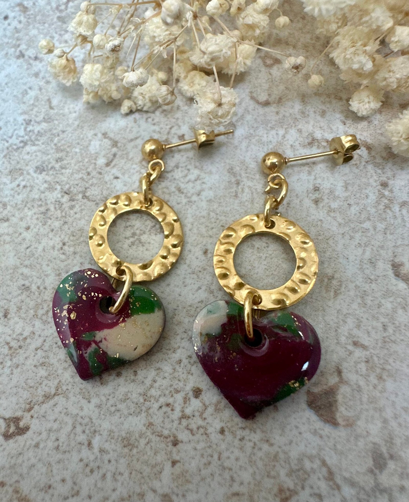 Élégantes et pleines de douceur, ces boucles d’oreilles dorées en acier inoxydable sont ornées d’un petit cœur en pâte polymère aux nuances beige, kaki et bordeaux.