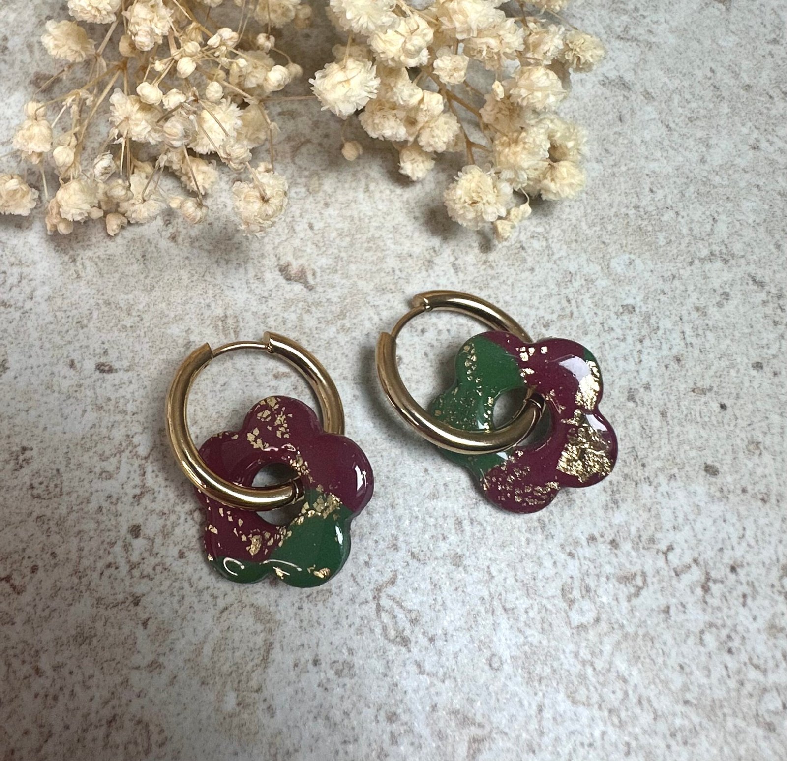 Délicates et élégantes, ces boucles d’oreilles en acier inoxydable sont ornées de petites fleurs en pâte polymère, réalisées à la main dans de jolies teintes bordeaux et kaki.