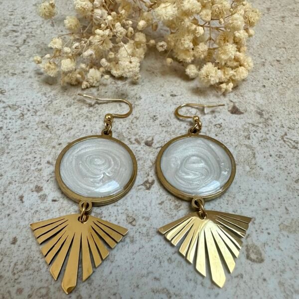 Élégantes et lumineuses, ces boucles d’oreilles en acier inoxydable doré sont sublimées par une résine nacrée aux reflets délicats.