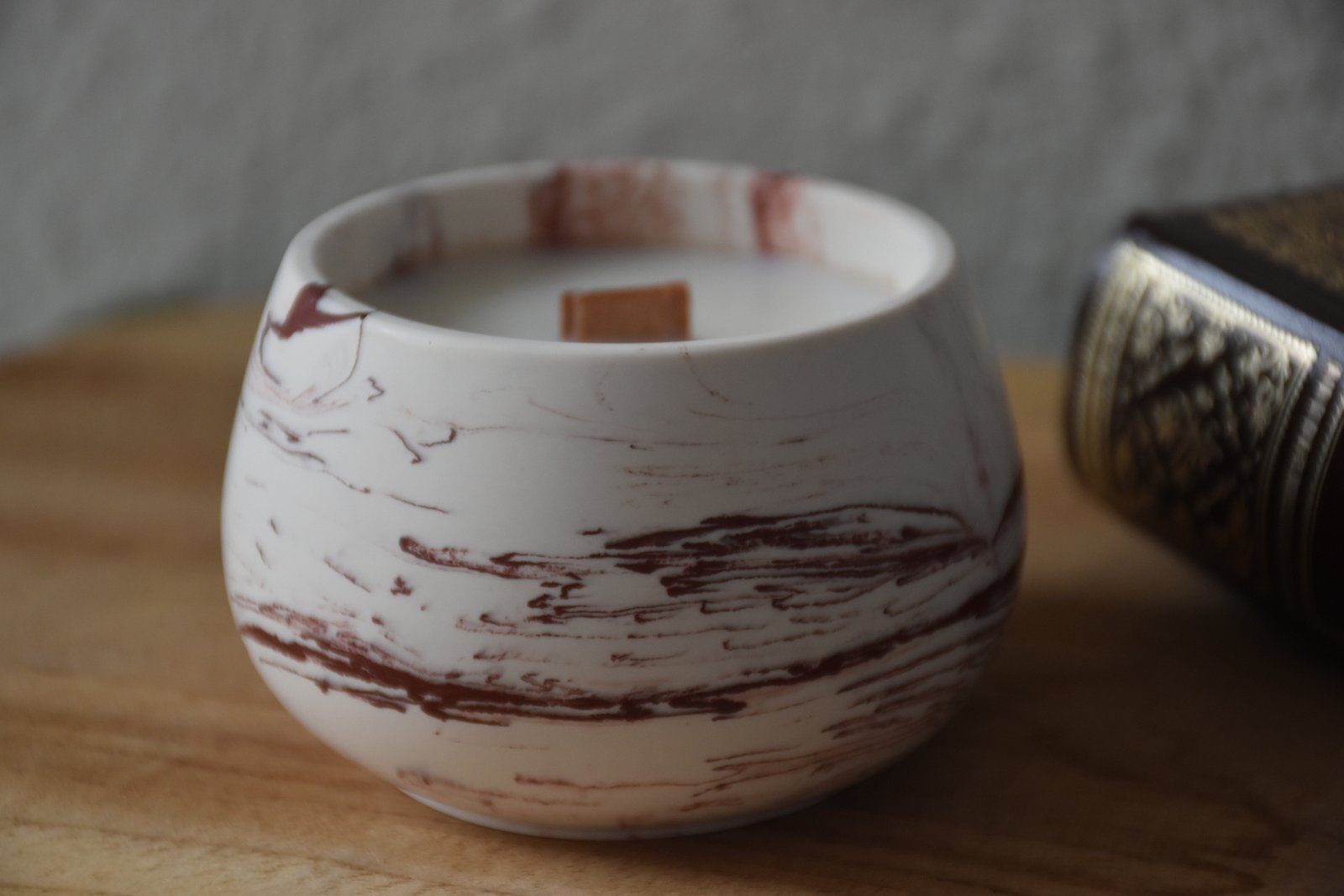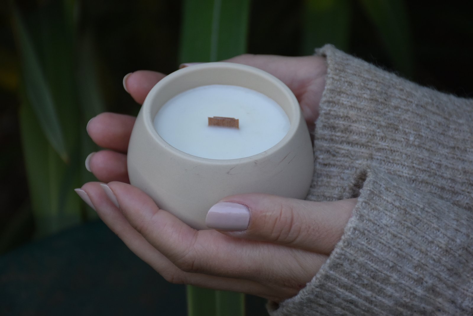 Chaque bougie est réalisée à la main dans mon atelier à Saint-Raphaël, en Jesmonite, avec une cire végétale et des parfums de Grasse.