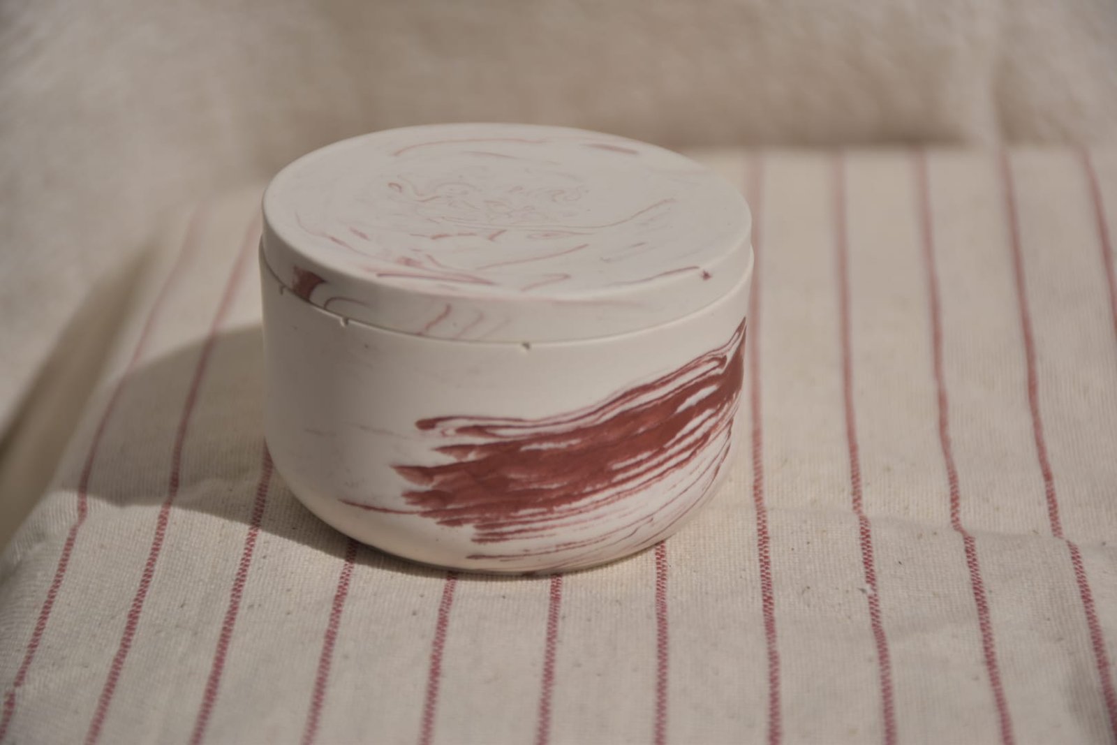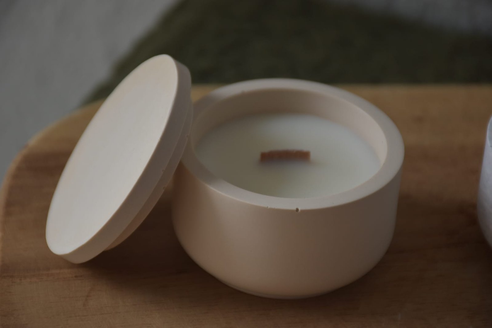 Chaque bougie est réalisée à la main dans mon atelier à Saint-Raphaël, en Jesmonite, avec une cire végétale et des parfums de Grasse.