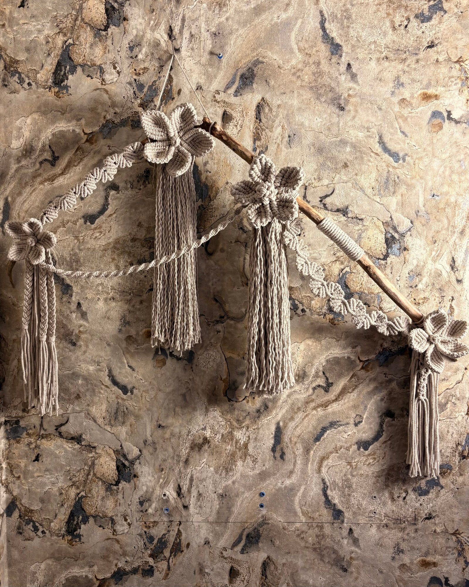Composée de fleurs texturées, de détails noués et de longues franges, elle apporte douceur, poésie et naturel à un intérieur bohème.
