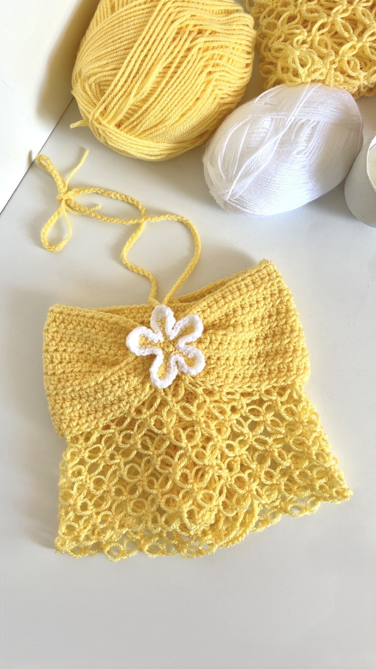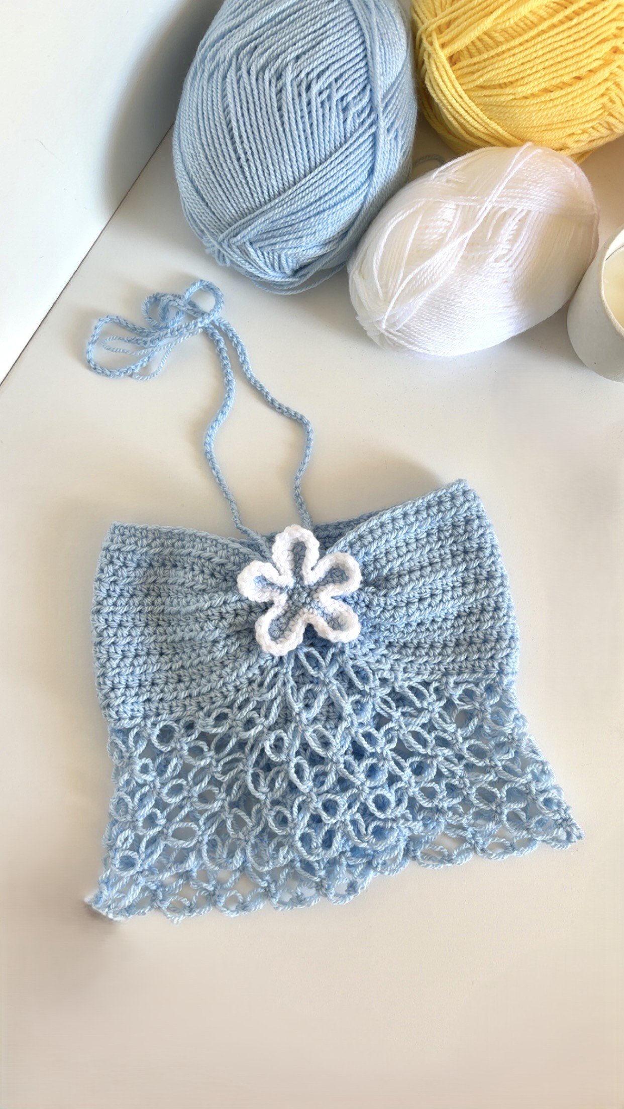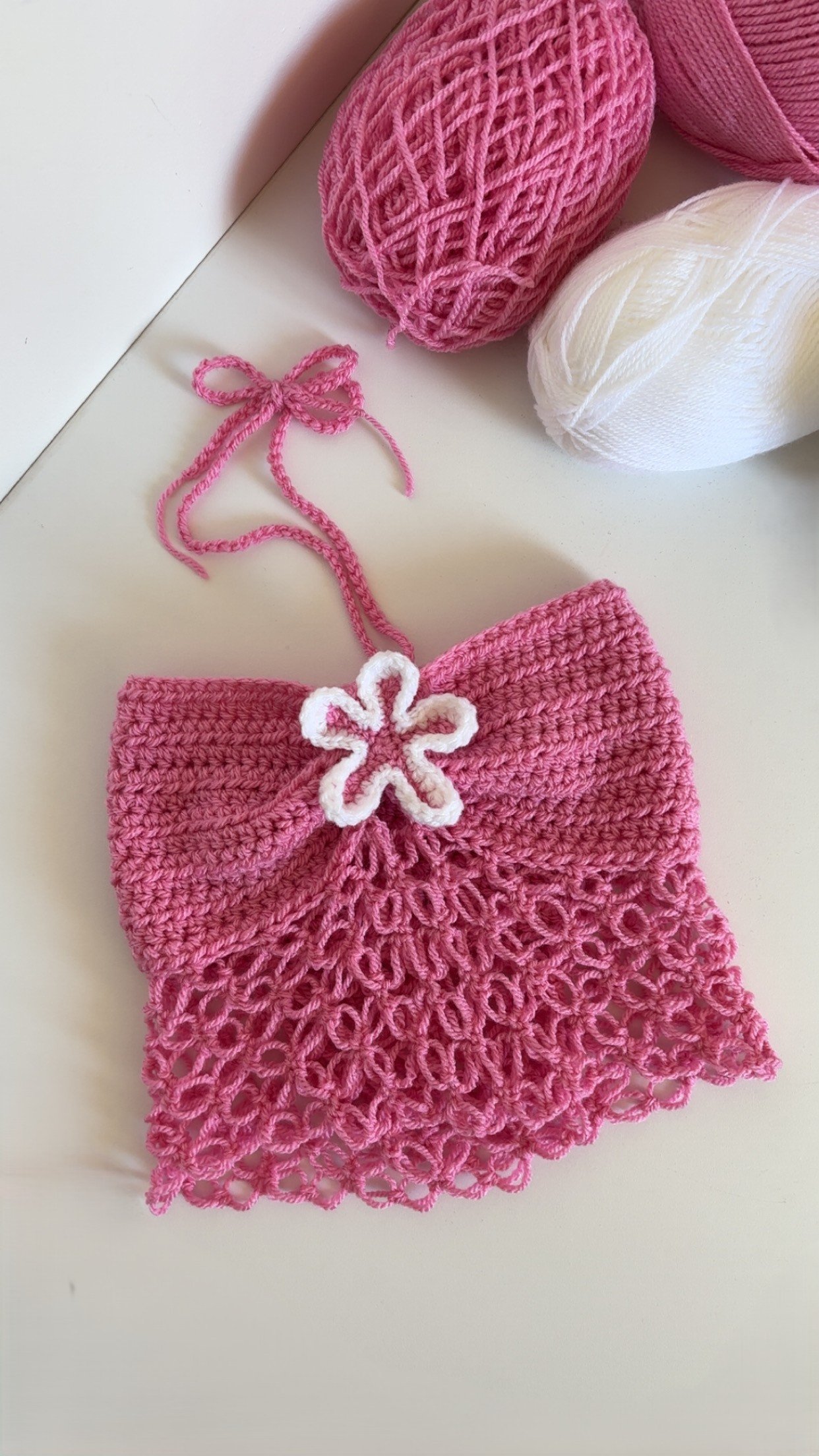 Entièrement réalisé au crochet, il allie la structure d’un bustier et la légèreté d’un point de filet.✨