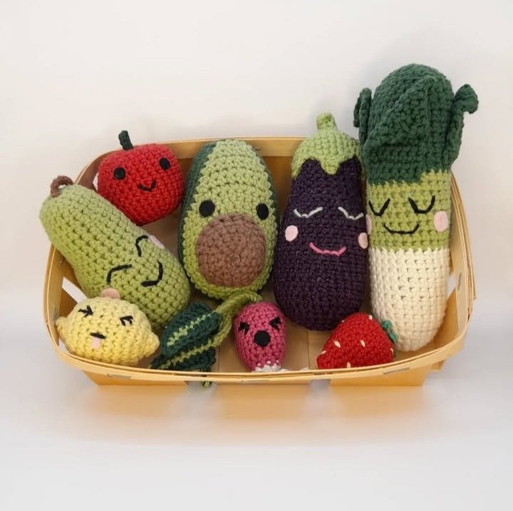 Les sujets sont de taille moyenne. Pour vous donner un ordre d’idée le poireau fait 15cm. Ce sont des pièces uniques réalisées en crochet avec du fil de coton.