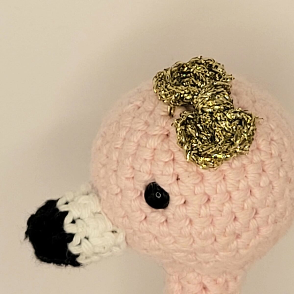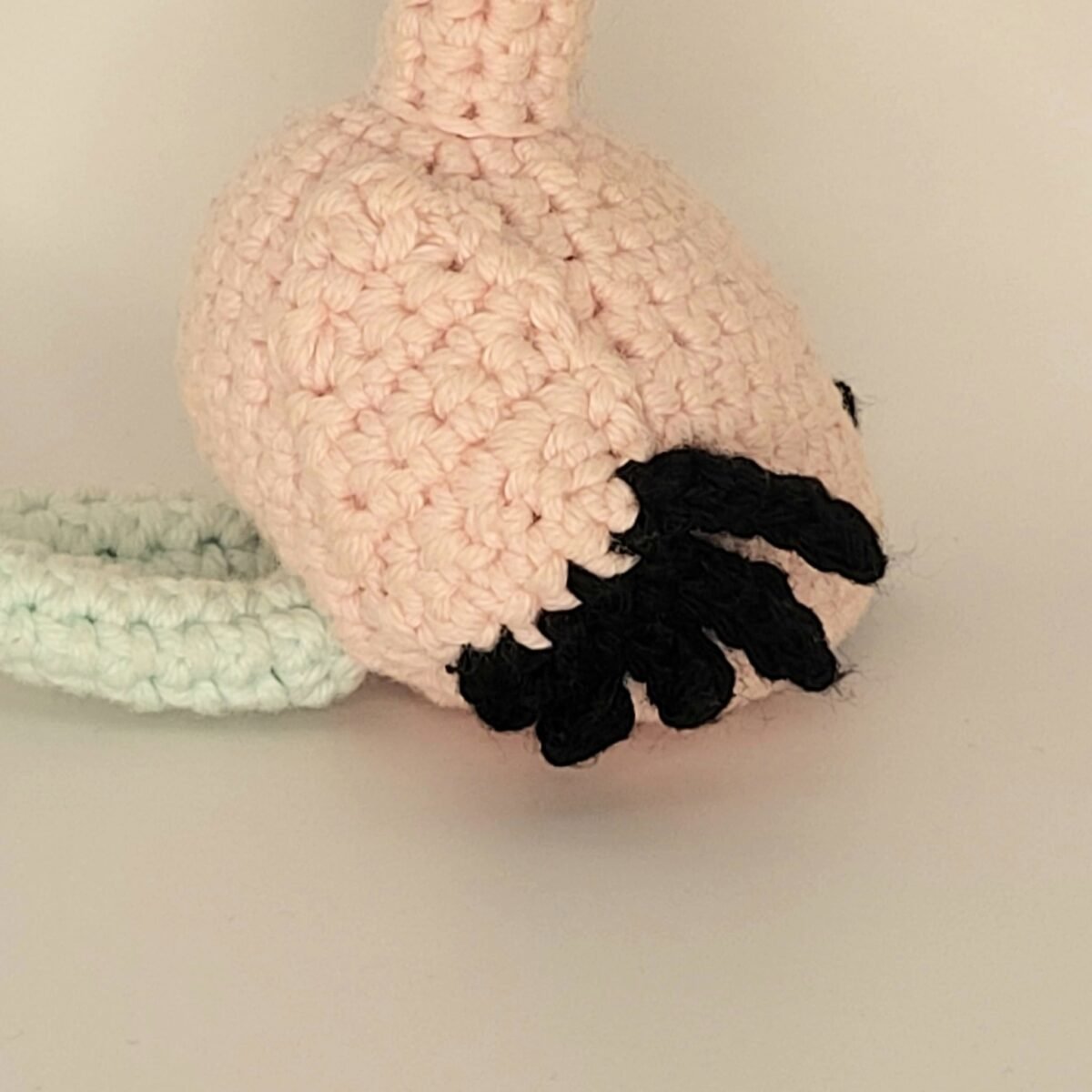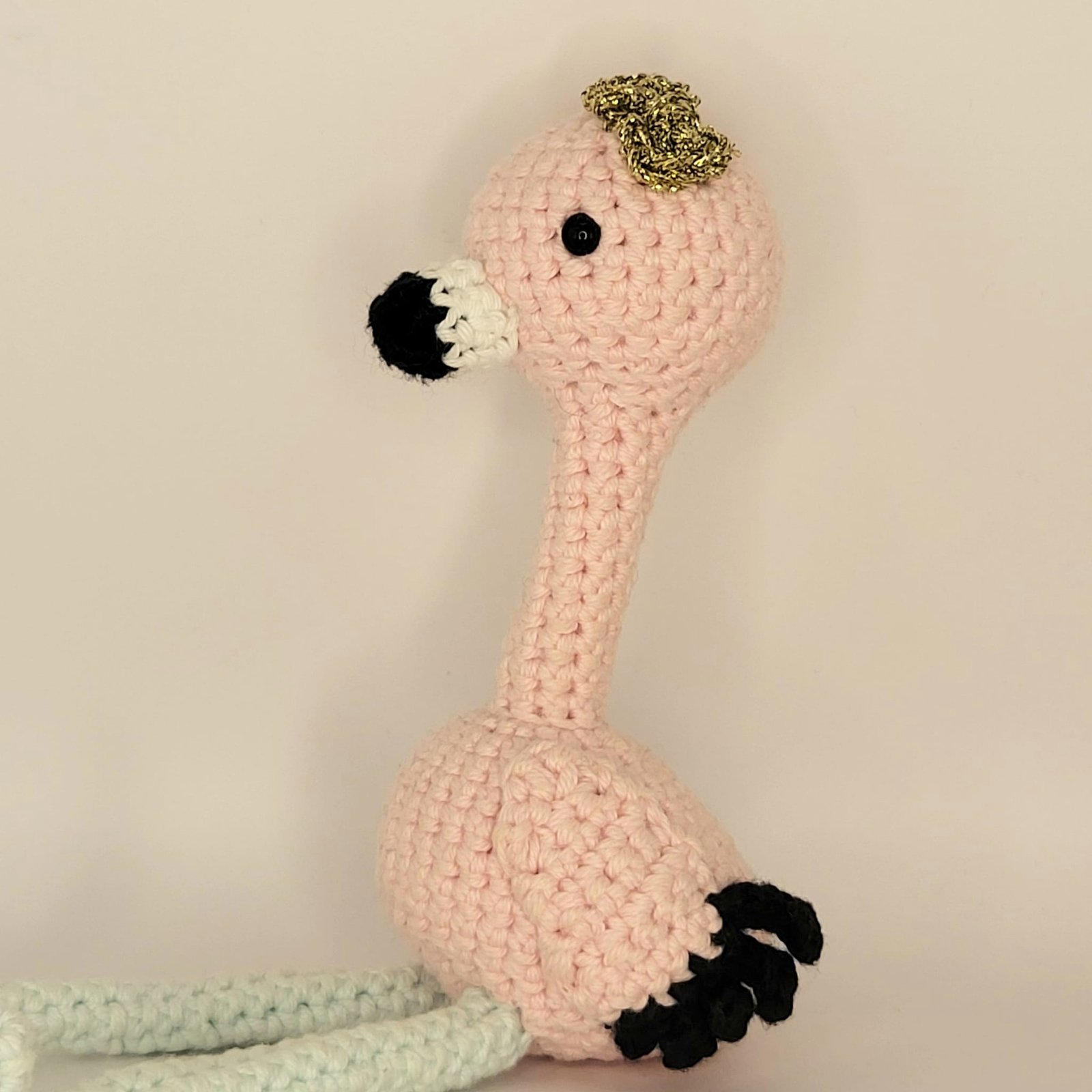Crocheté à la main avec des tons doux de rose pâle et bleu menthe, ses plumes noires et son nœud doré lui donnent un petit charme élégant et délicat.