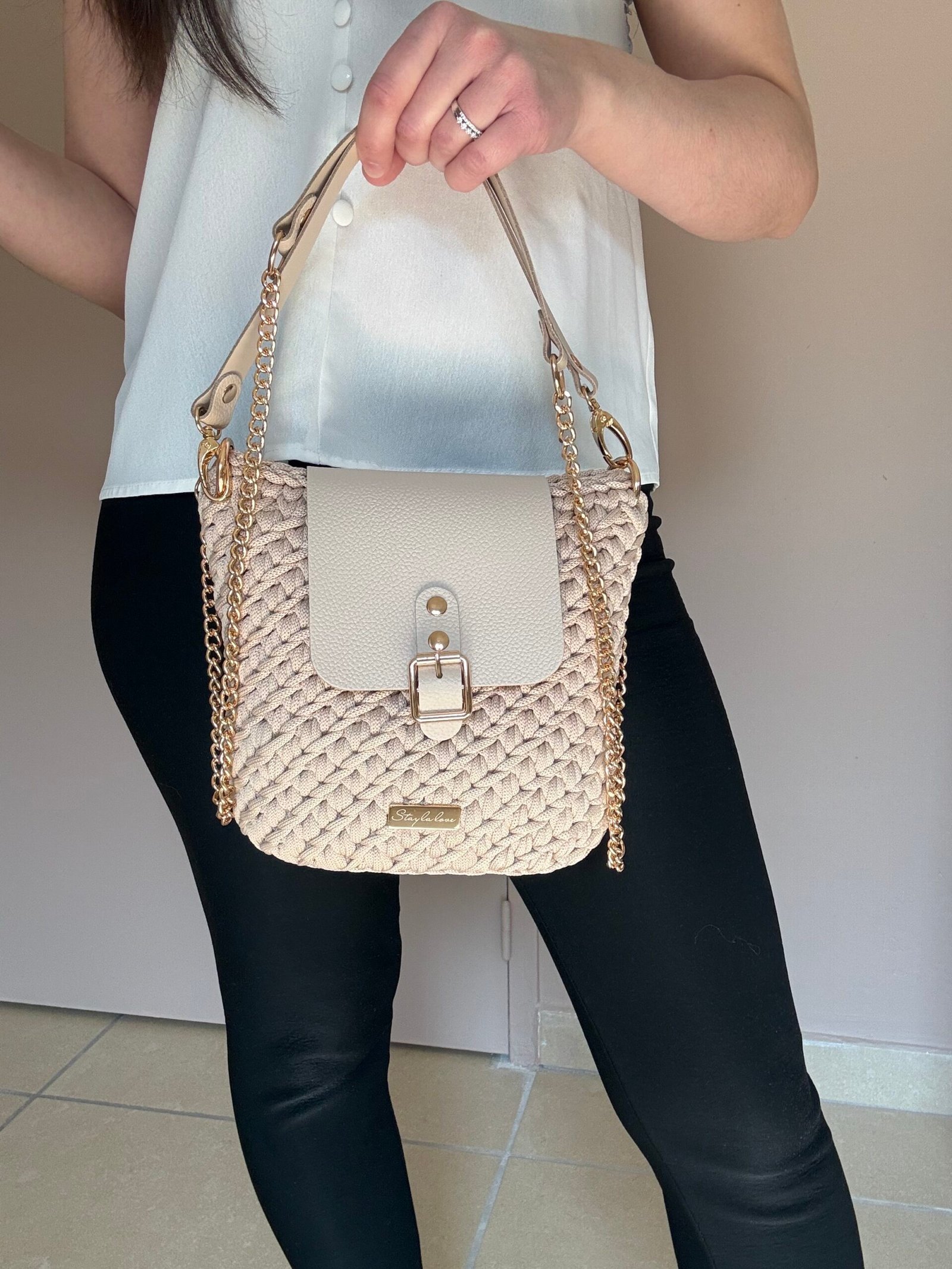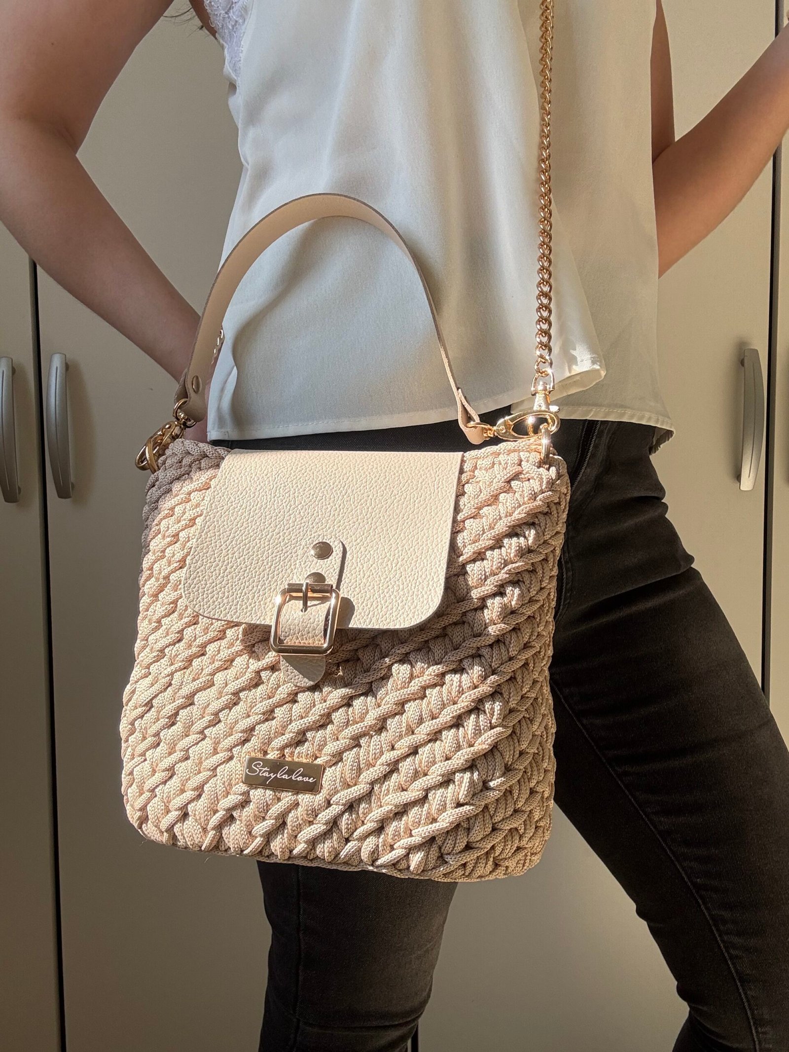 Laissez-vous séduire par ce sac bandoulière en crochet fait main, pensé pour celles qui aiment les accessoires uniques. Son rabat en cuir naturel s’accorde parfaitement avec son style bohème chic, pour une allure à la fois élégante et décontractée.