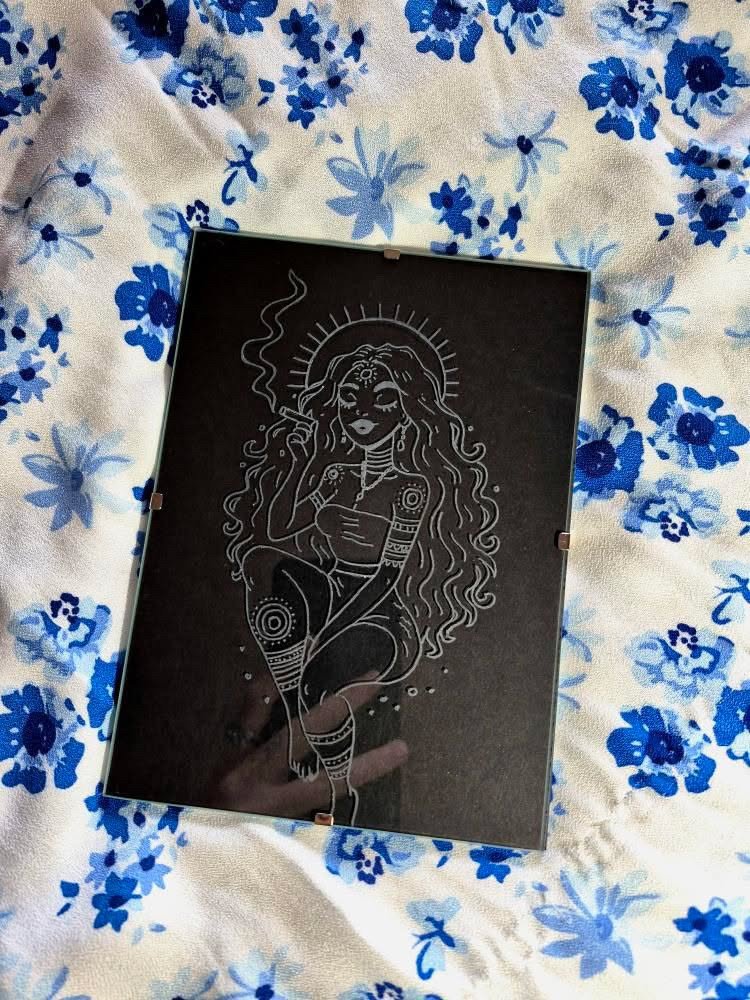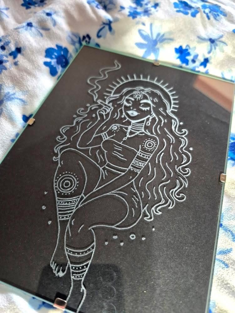 Gravure d’une femme soleil sur plaque en verre minéral, avec fond en feuille de papier noir (vous pouvez donc changer la couleur si vous en avez d’autres). En 18 cm x 13 cm.