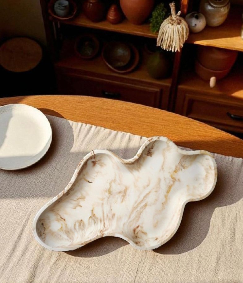 Ce plateau décoratif se distingue par sa forme organique et fluide, évoquant des courbes naturelles et contemporaines. Conçu dans un matériau à l’aspect marbré, il présente un élégant mélange de blanc cassé et de veinures ambrées qui créent un mouvement visuel apaisant.