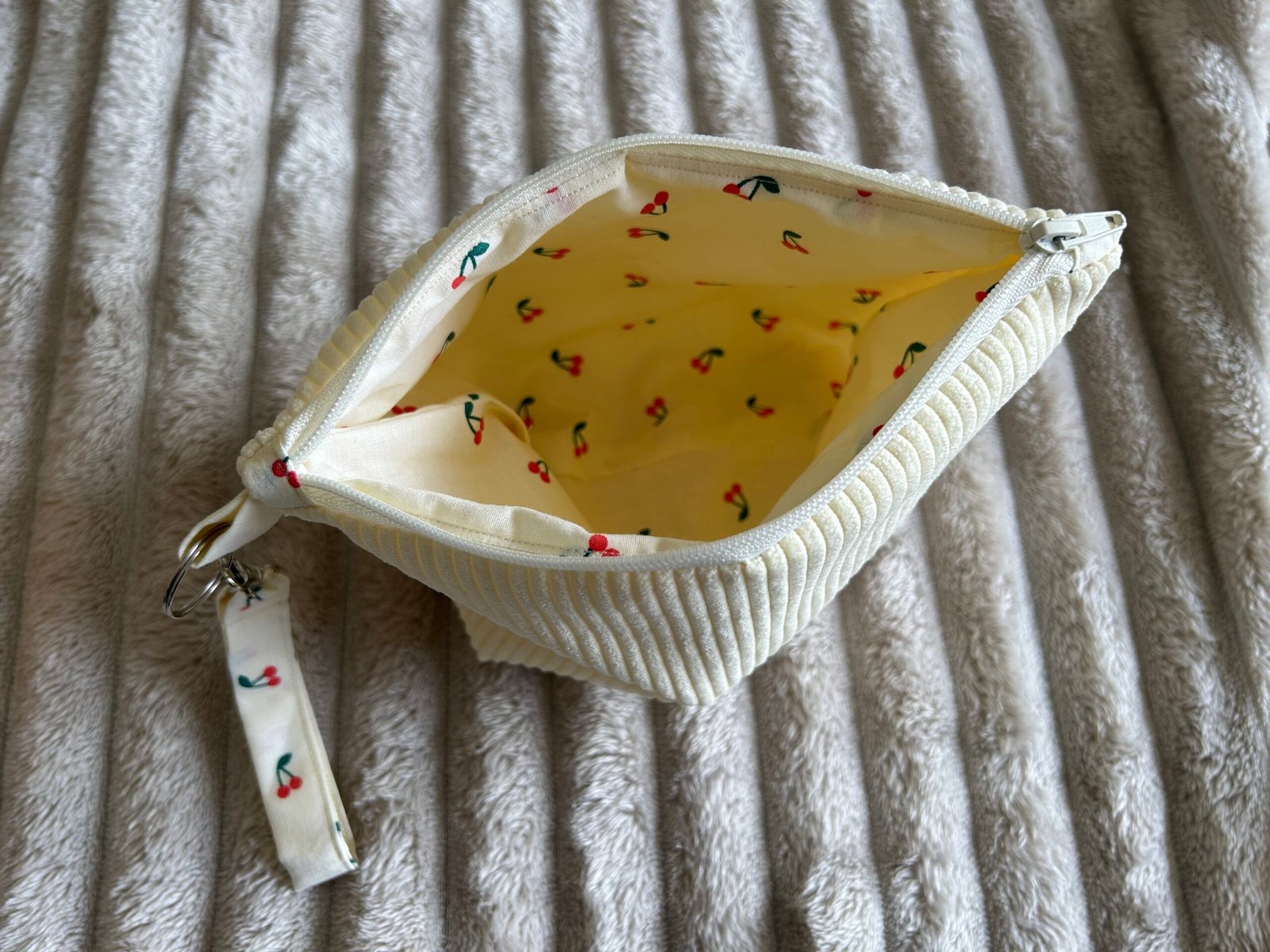 Pochette en velours côtelé avec porte-clés assorti – Blanc et cerises