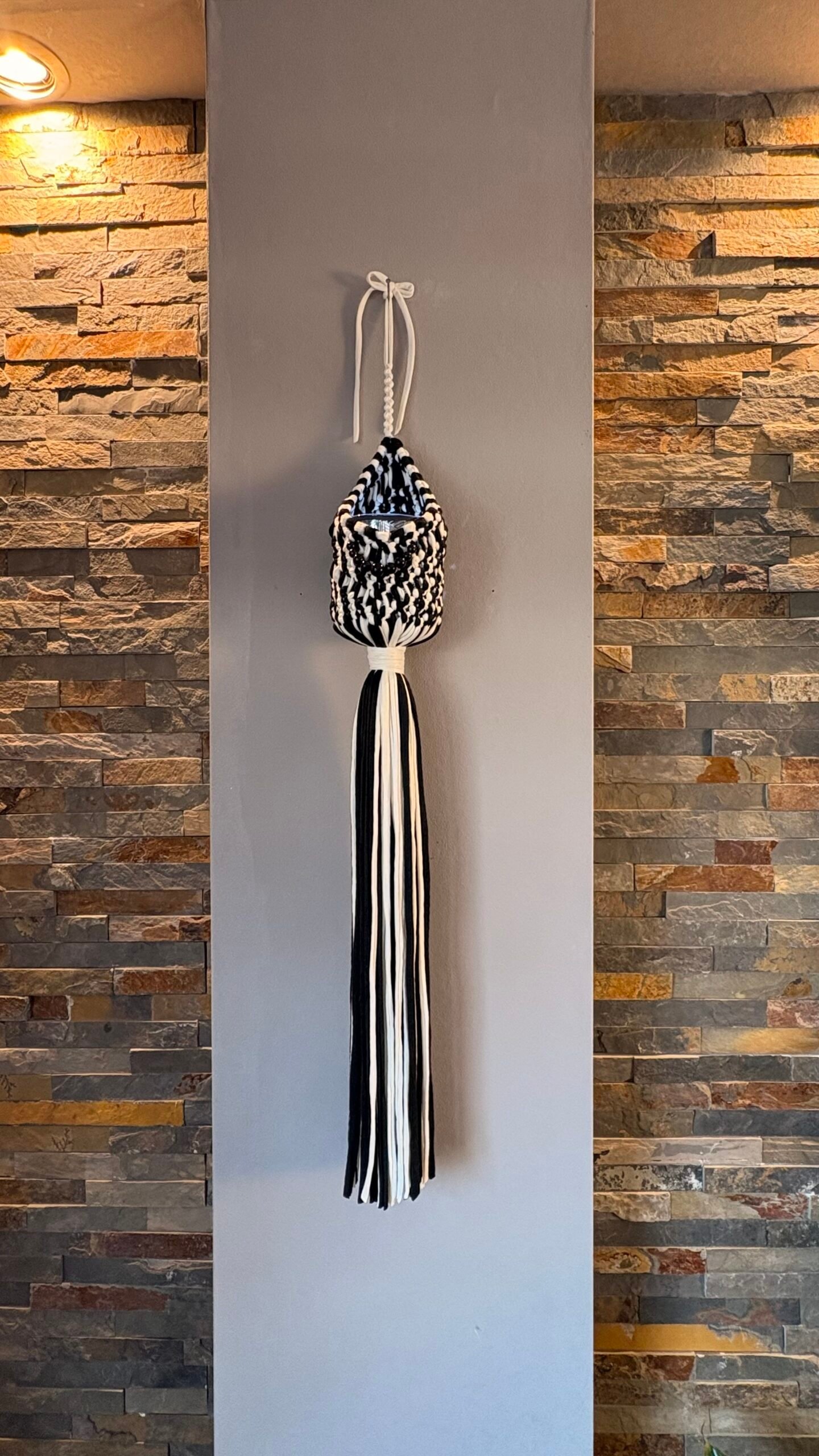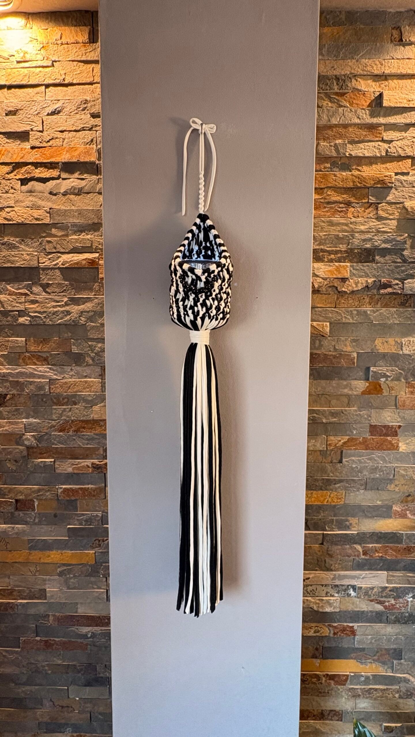 Porte-plante suspendu en macramé tressé noir et blanc – Support de pot suspendu – Décoration murale bohème