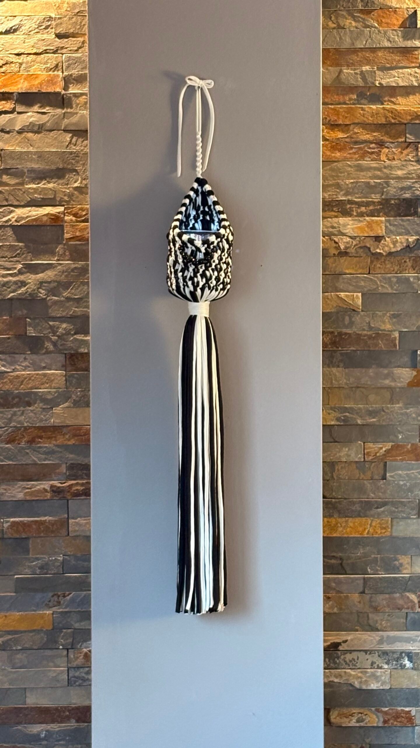 Fabriquée avec soin à partir de cordons tressés en noir et blanc de haute qualité, cette suspension unique en son genre mettra en valeur vos plantes préférées et apportera une touche de nature et de texture à votre espace.