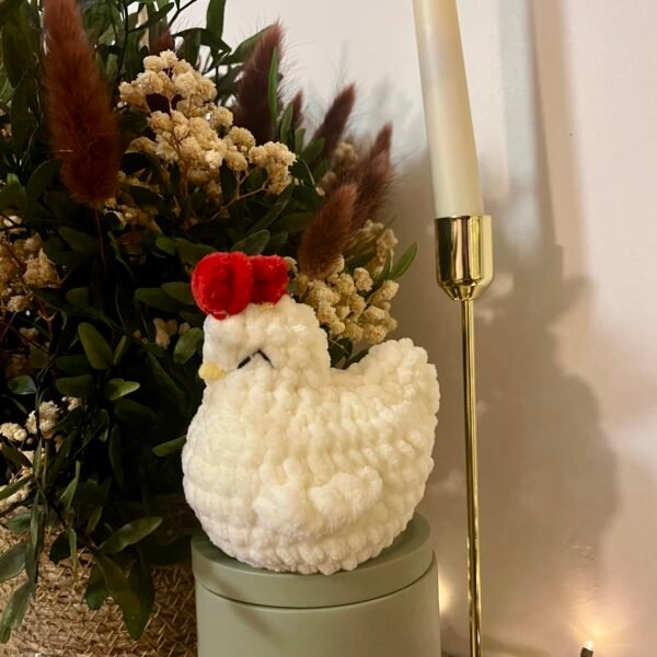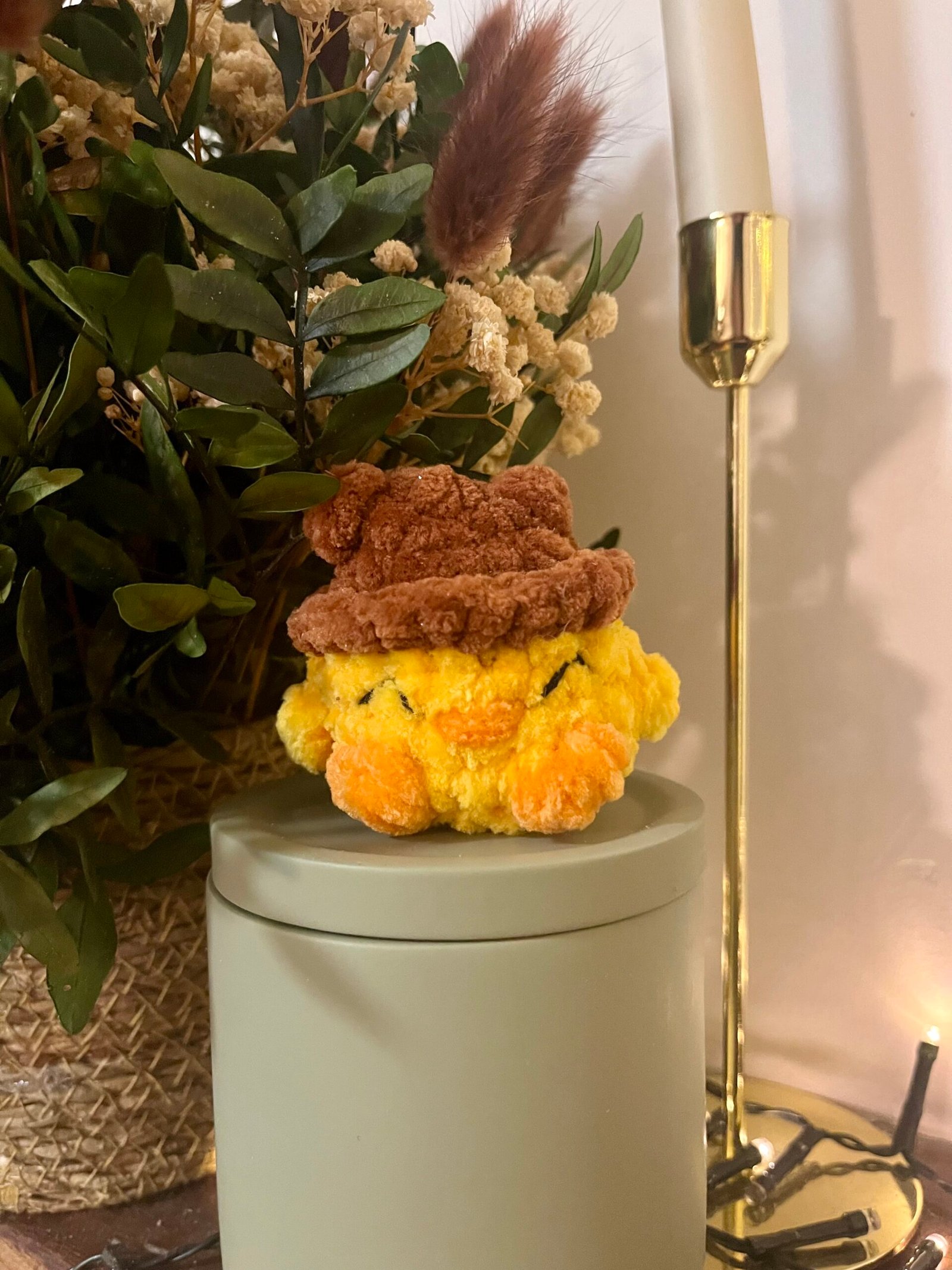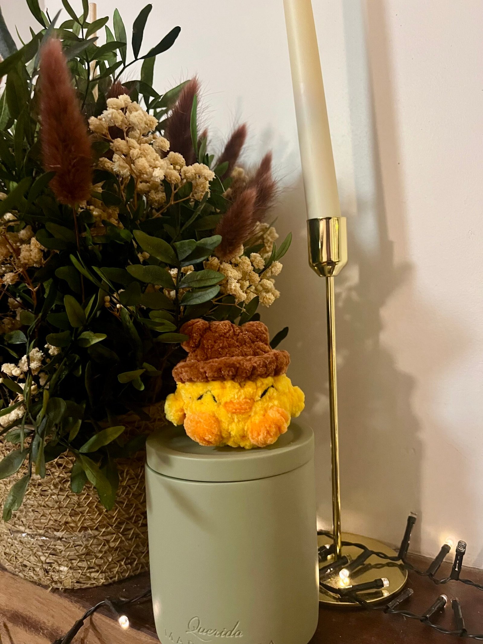 Petit poussin avec son chapeau de cow-boy, crocheté à la main.