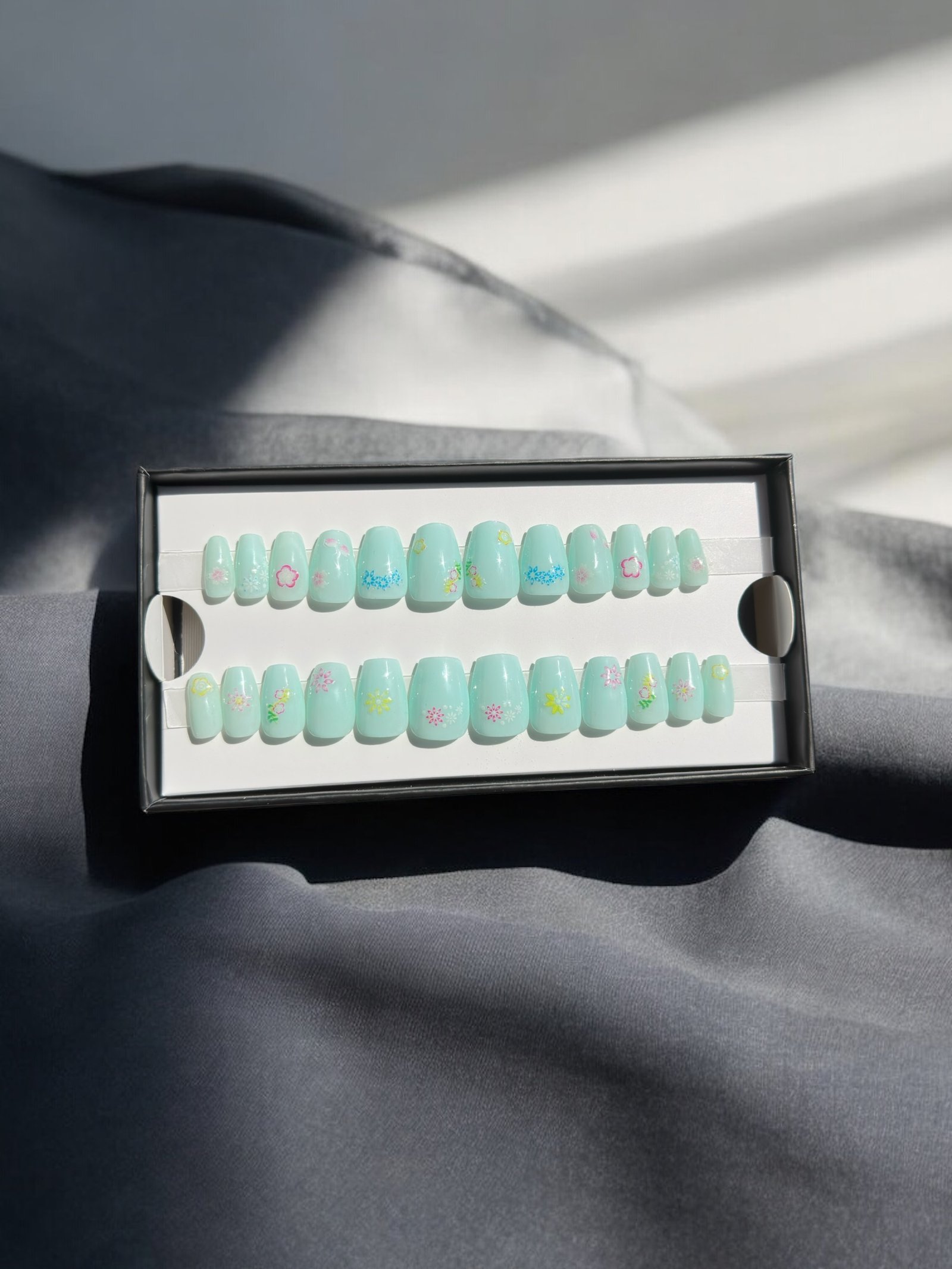 Ce kit de press-on nails se distingue par sa base vert menthe pastel rafraîchissante, ornée de délicats motifs floraux multicolores. Son esthétique bucolique et printanière apporte une touche de légèreté et de gaieté à votre style quotidien. Conçu pour une pose rapide et professionnelle à domicile, ce modèle allie la finesse d’un travail artisanal à la praticité d’un accessoire réutilisable et respectueux de vos ongles naturels.