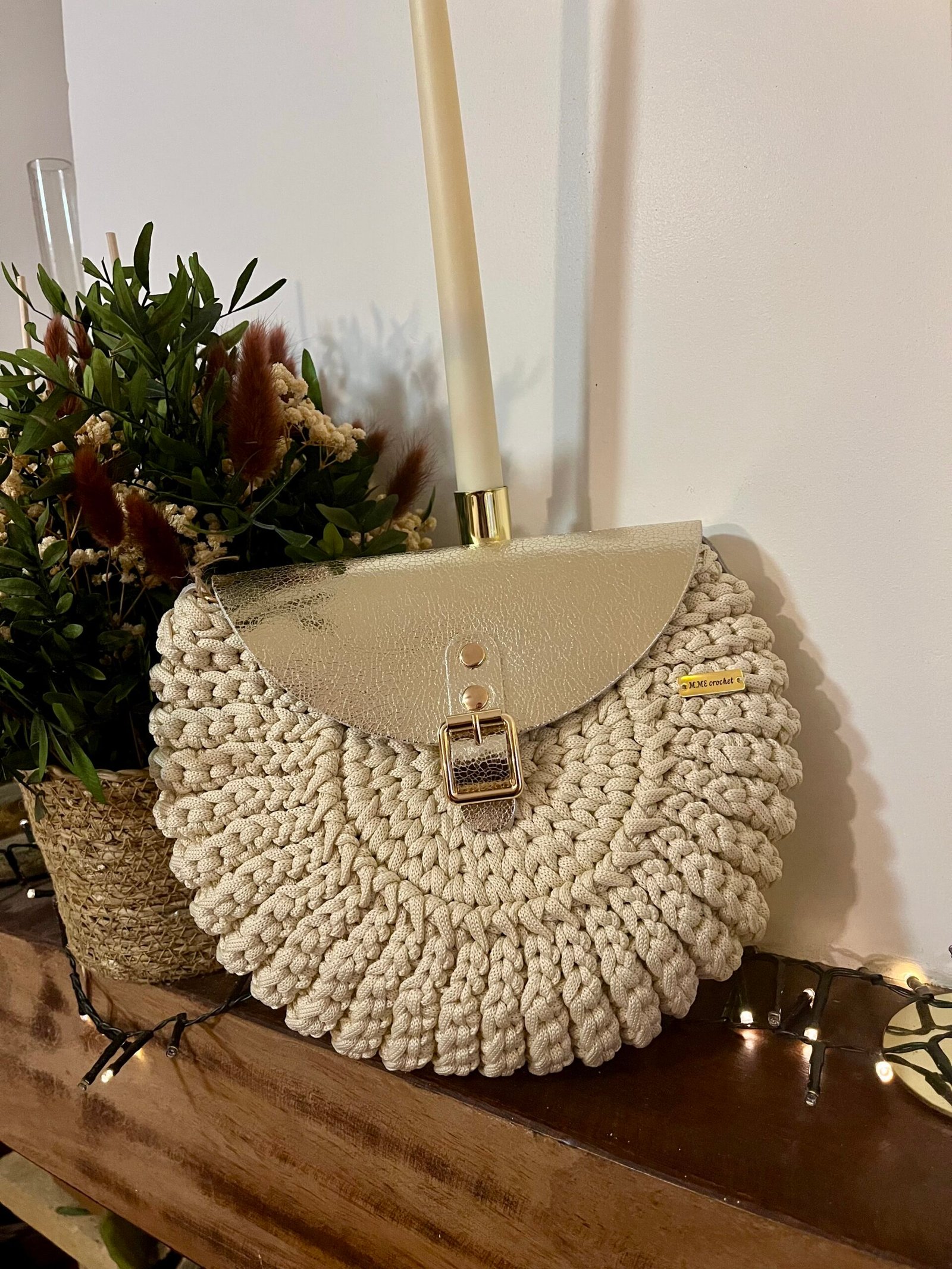 Sac en fil polyester crème, avec accessoires en cuir doré.