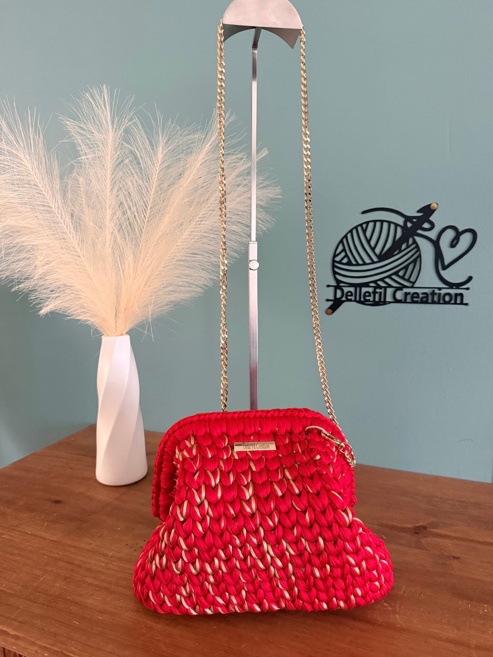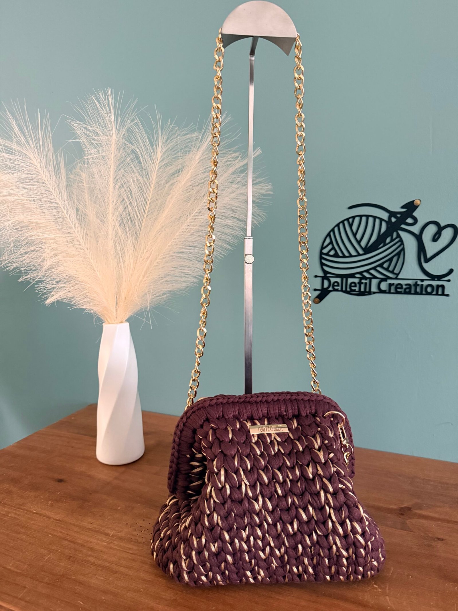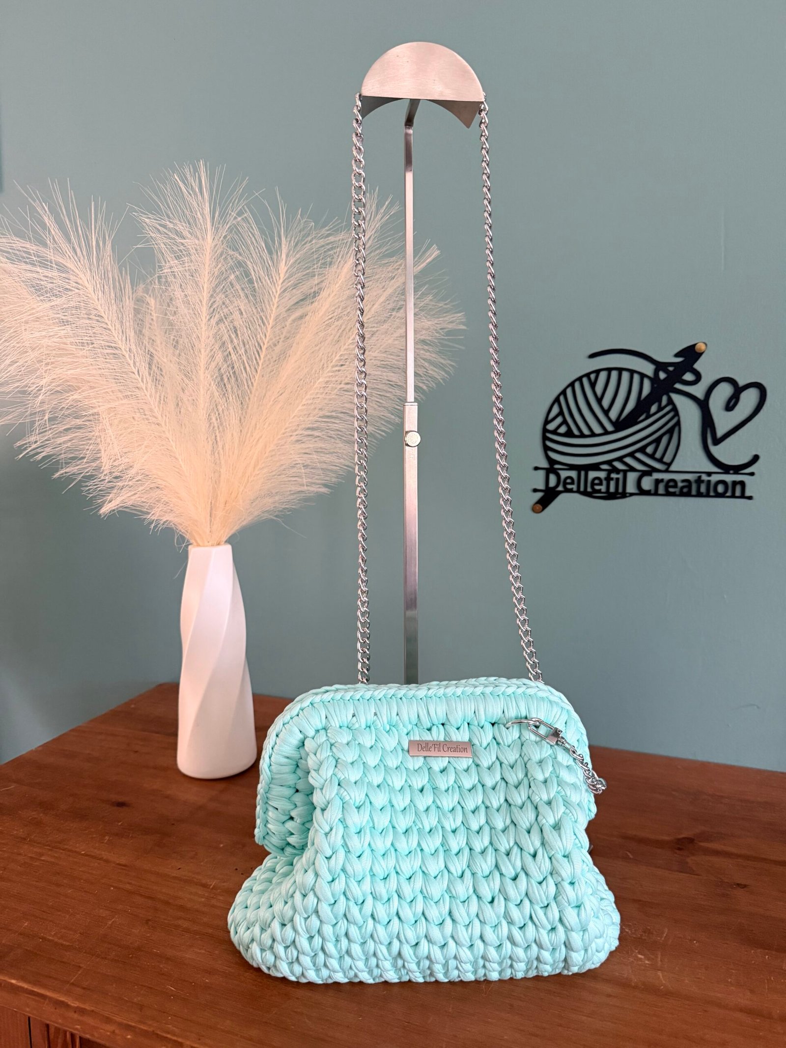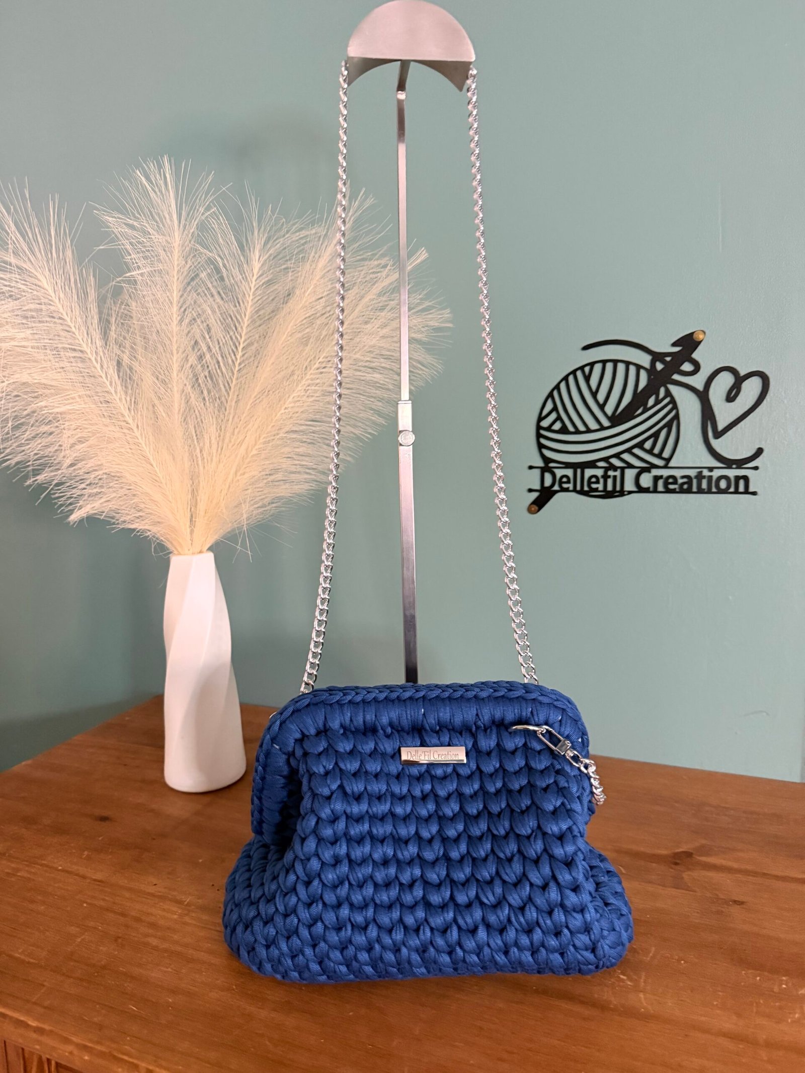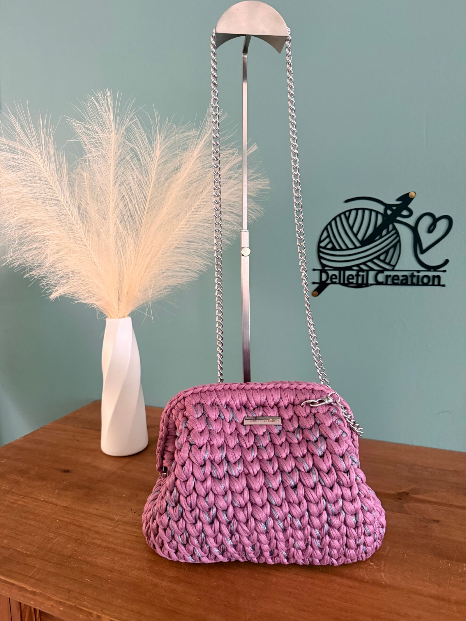 Sac réalisé à la main au crochet en fil polyester avec sa chaîne en Acier inoxydable assortie de 120cm