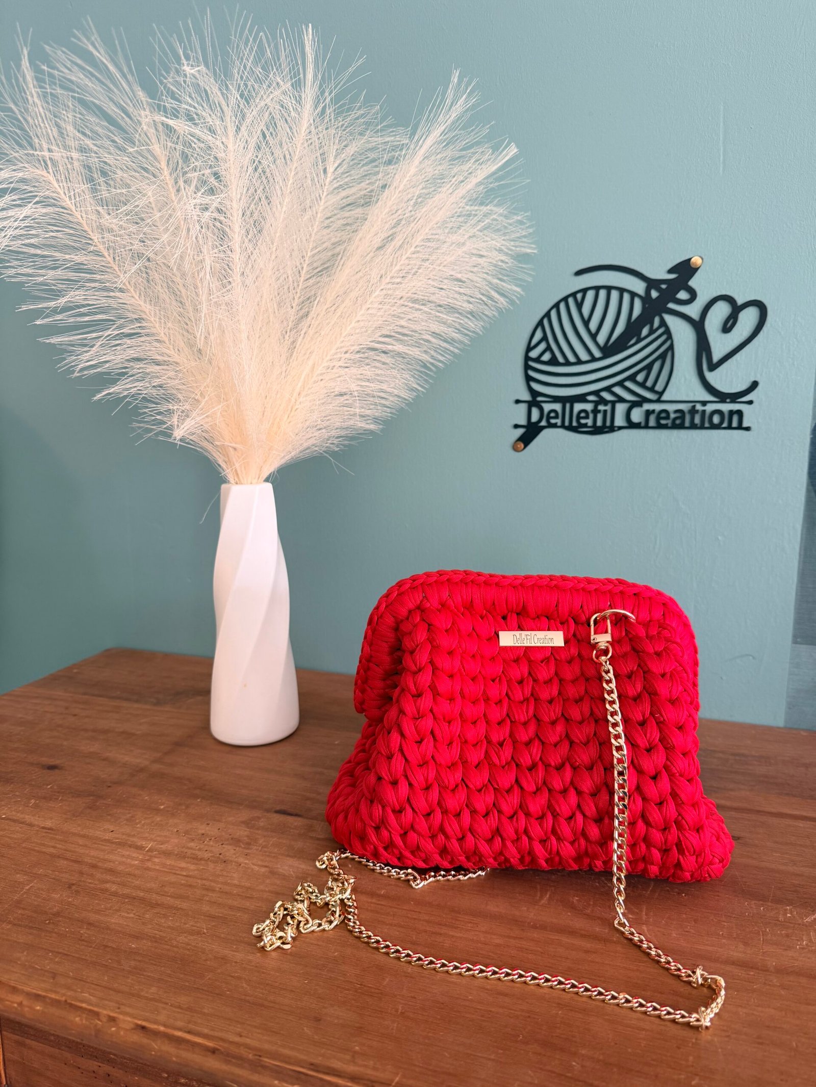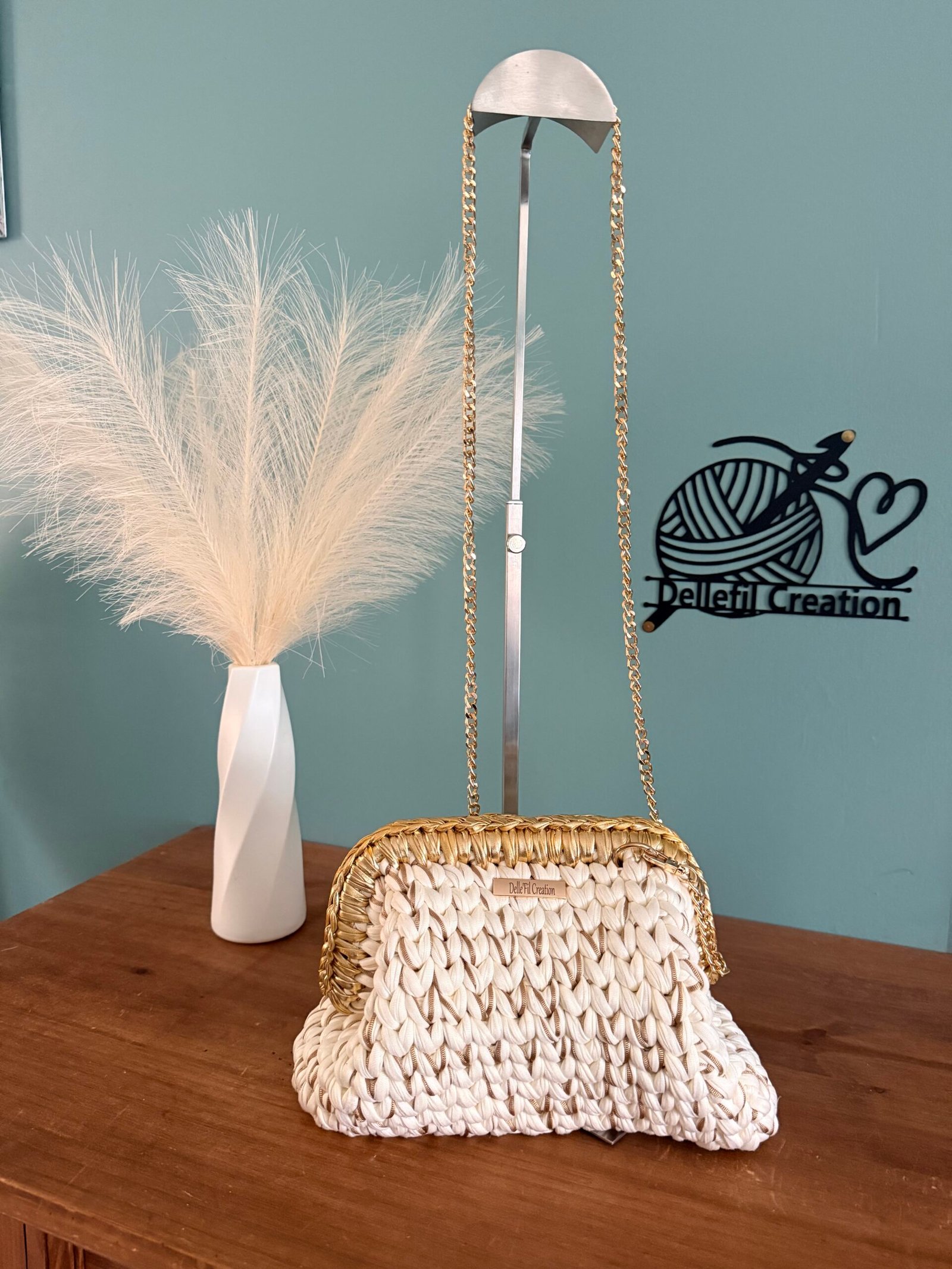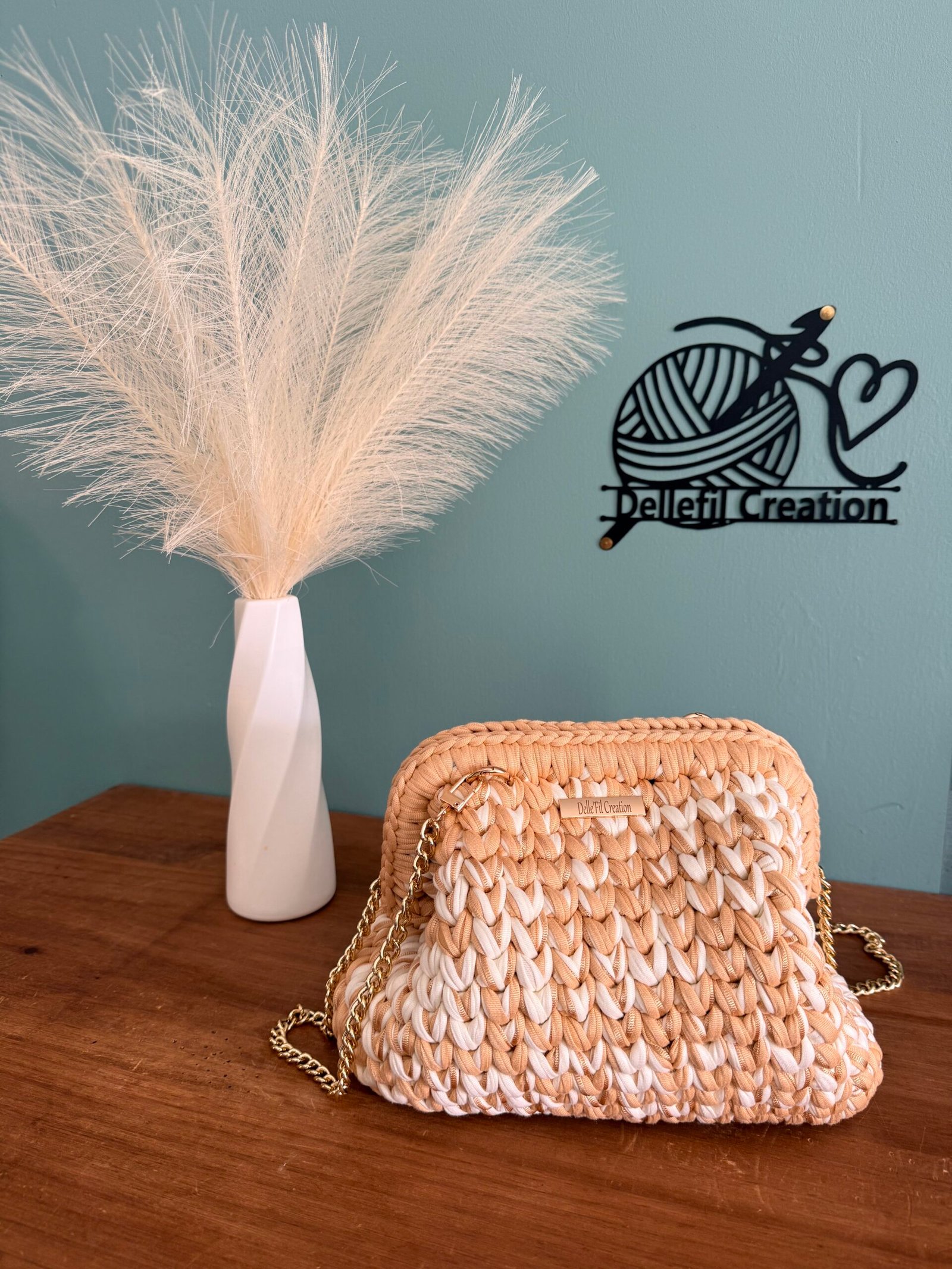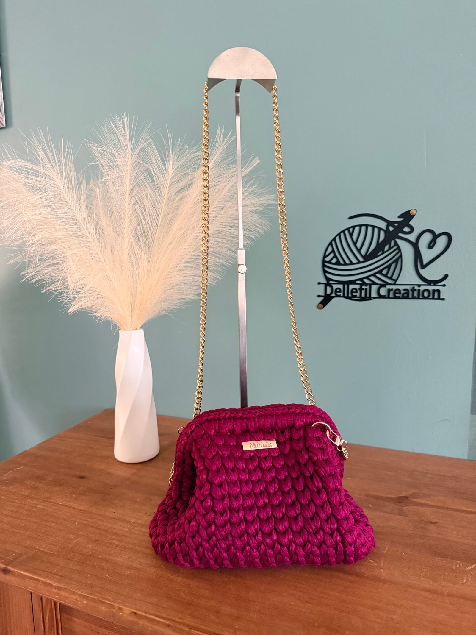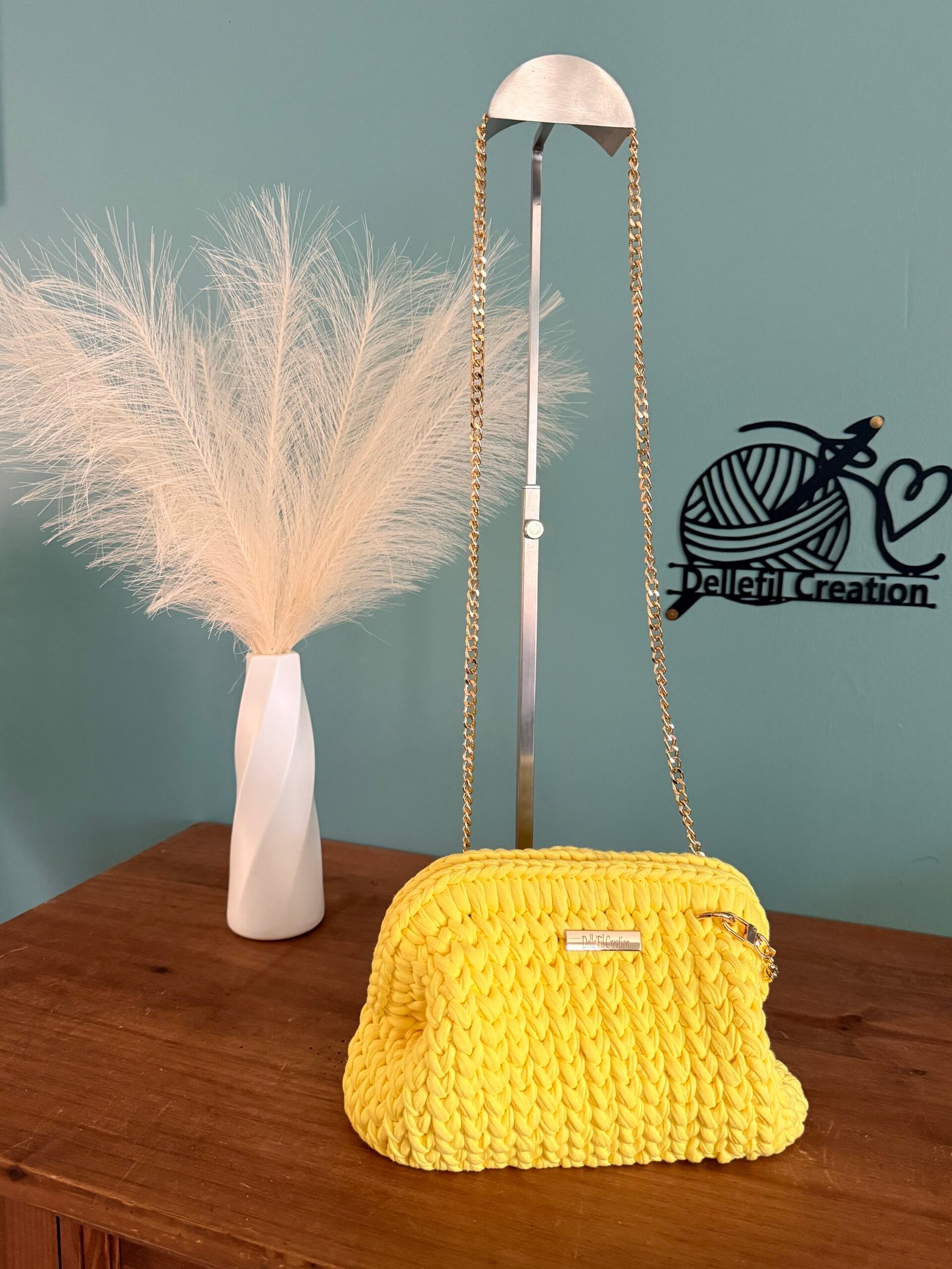 Sac réalisé à la main au crochet en fil polyester avec sa chaîne en Acier inoxydable assortie de 120cm