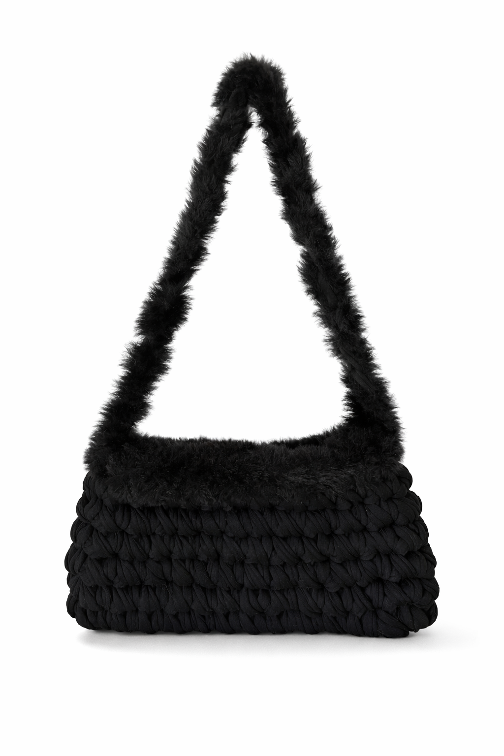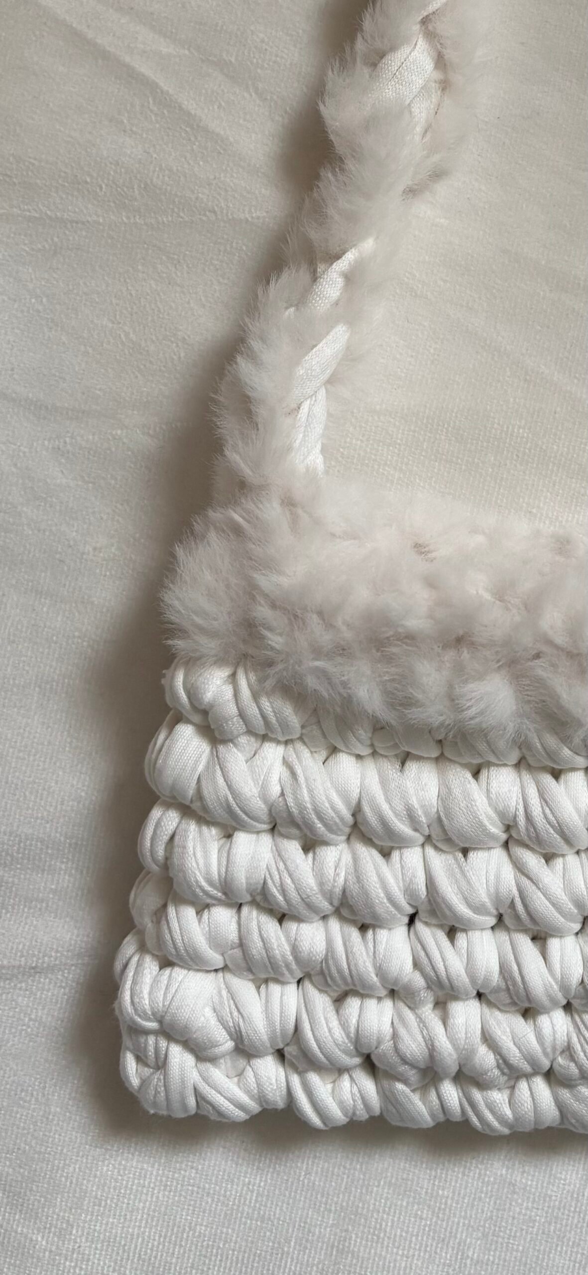 Ce sac à main fait main combine un fil t-shirt en coton élégant avec une fausse fourrure douce et chaleureuse pour un look à la fois chic et cosy.